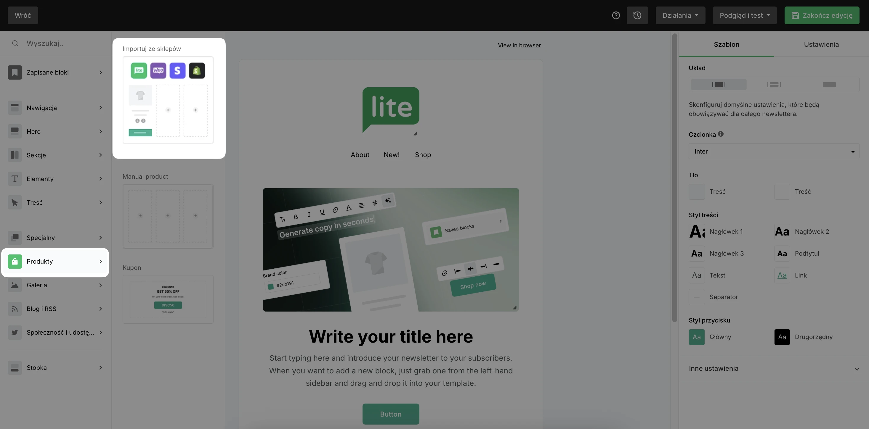 Blok Produkty w naszym edytorze Drag & drop umożliwia dodanie Produktu bezpośrednio do kampanii w MailerLite.
