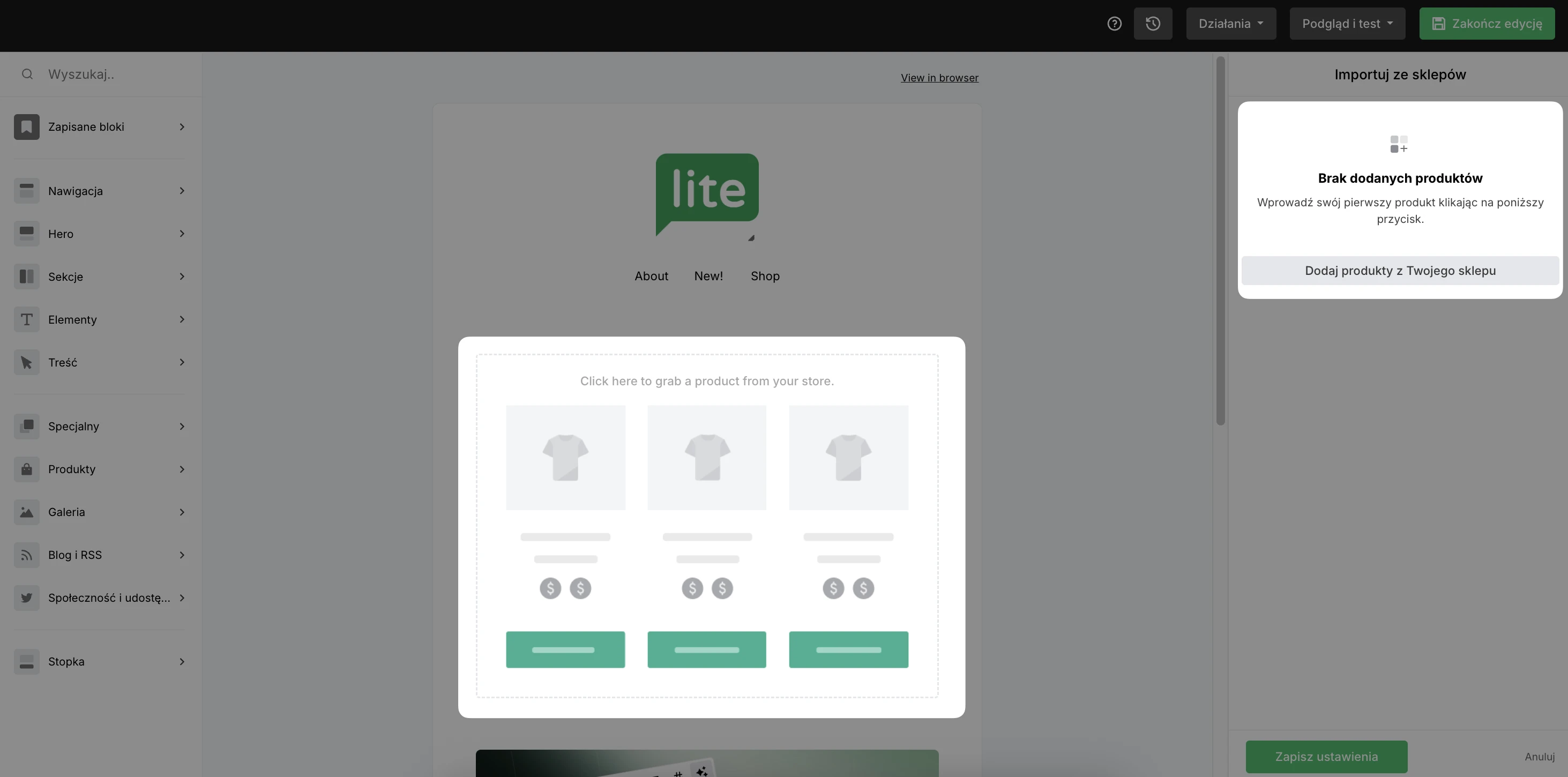 Podobnie jak w przypadku kreatora kampanii, blok Produkty jest również dostępny w kreatorze landing page'y i stron internetowych.