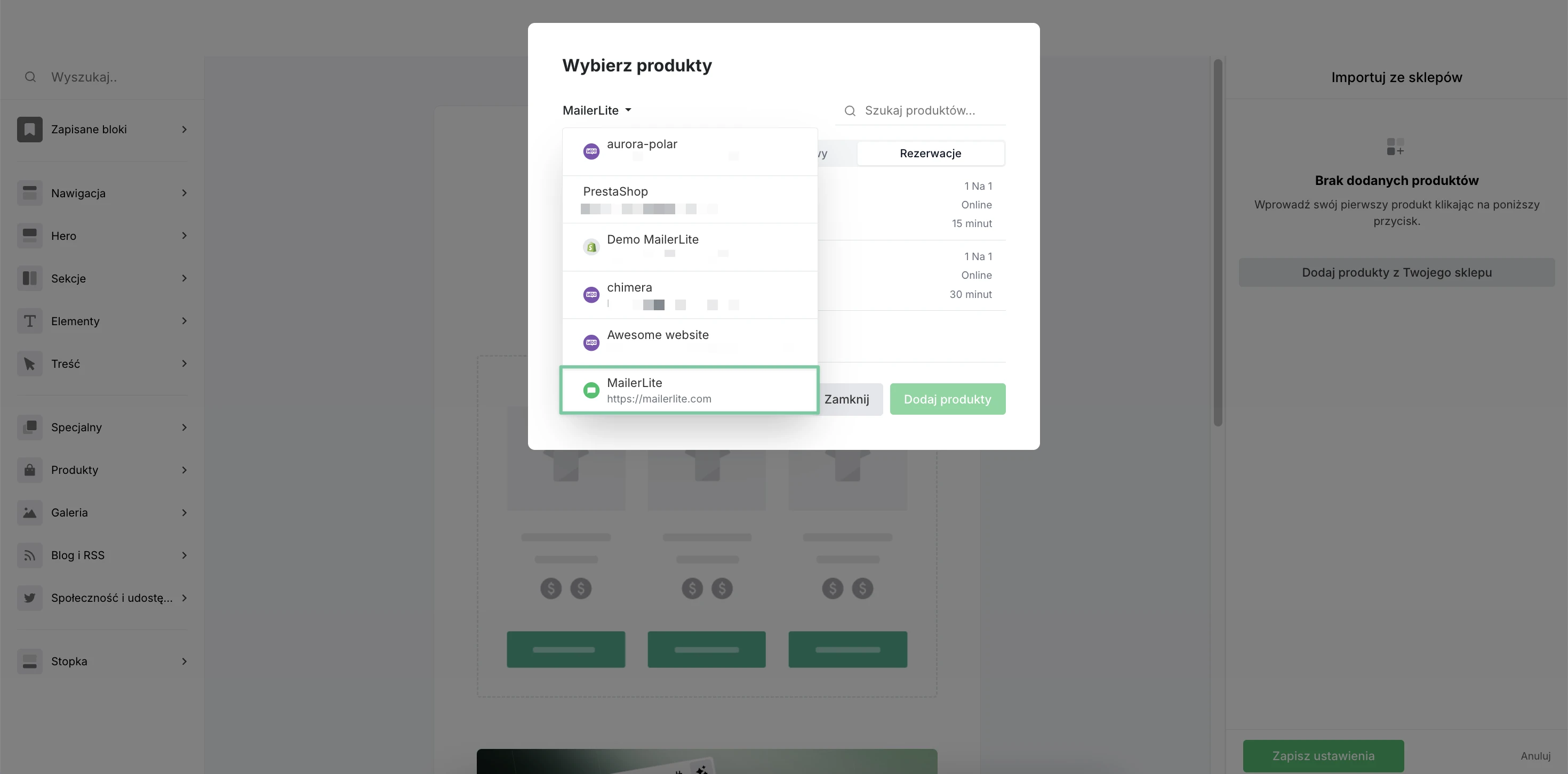 4. Jeśli na Twoim koncie masz zintegrowanych kilka sklepów pamiętaj o wybraniu sklepu MailerLite, by móc przejść do listy Twoich produktów.