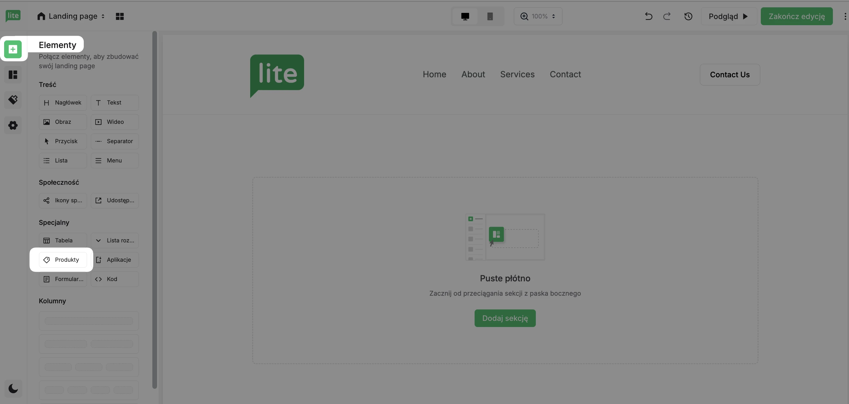 W edytorze landing page pod opcją Elementy znajdziesz kategorię Specjalne, a tam element Produkty.