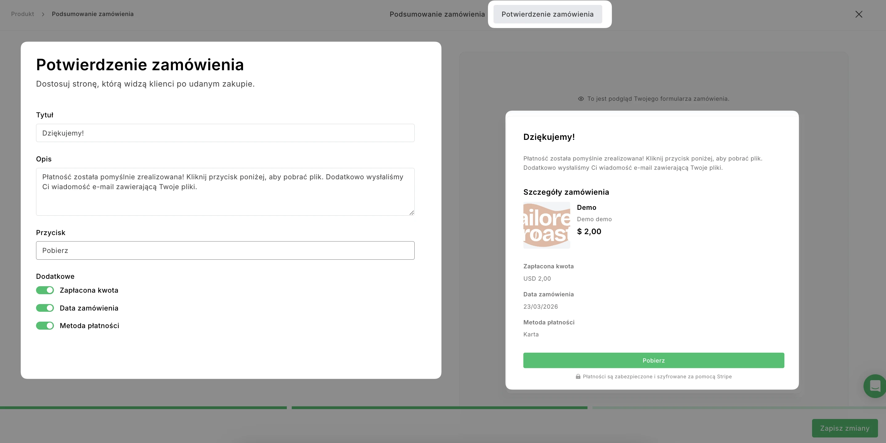 Przejdź do zakładki Potwierdzenie zamówienia, aby edytować stronę, która zostanie wyświetlona kupującemu po dokonaniu zakupu. Tutaj możesz wybrać widoczność szczegółów produktu, takich jak Kwota i Data zamówienia.