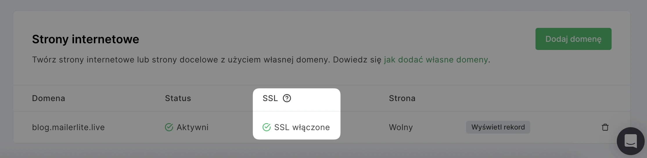 Po zatwierdzeniu rekordów CNAME lub typu A automatycznie rozpocznie się proces włączania SSL. Status SSL można znaleźć w kolumnie SSL.