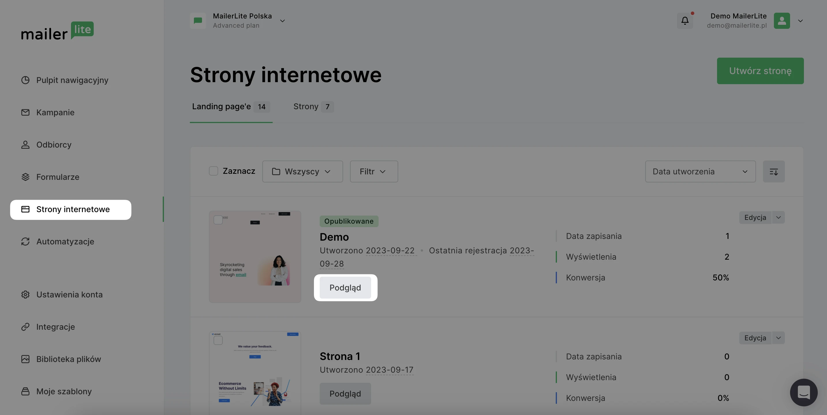 2. Kliknij przycisk Podgląd przy Landing page'e lub Strony, do której chcesz podpiąć swoją domenę.