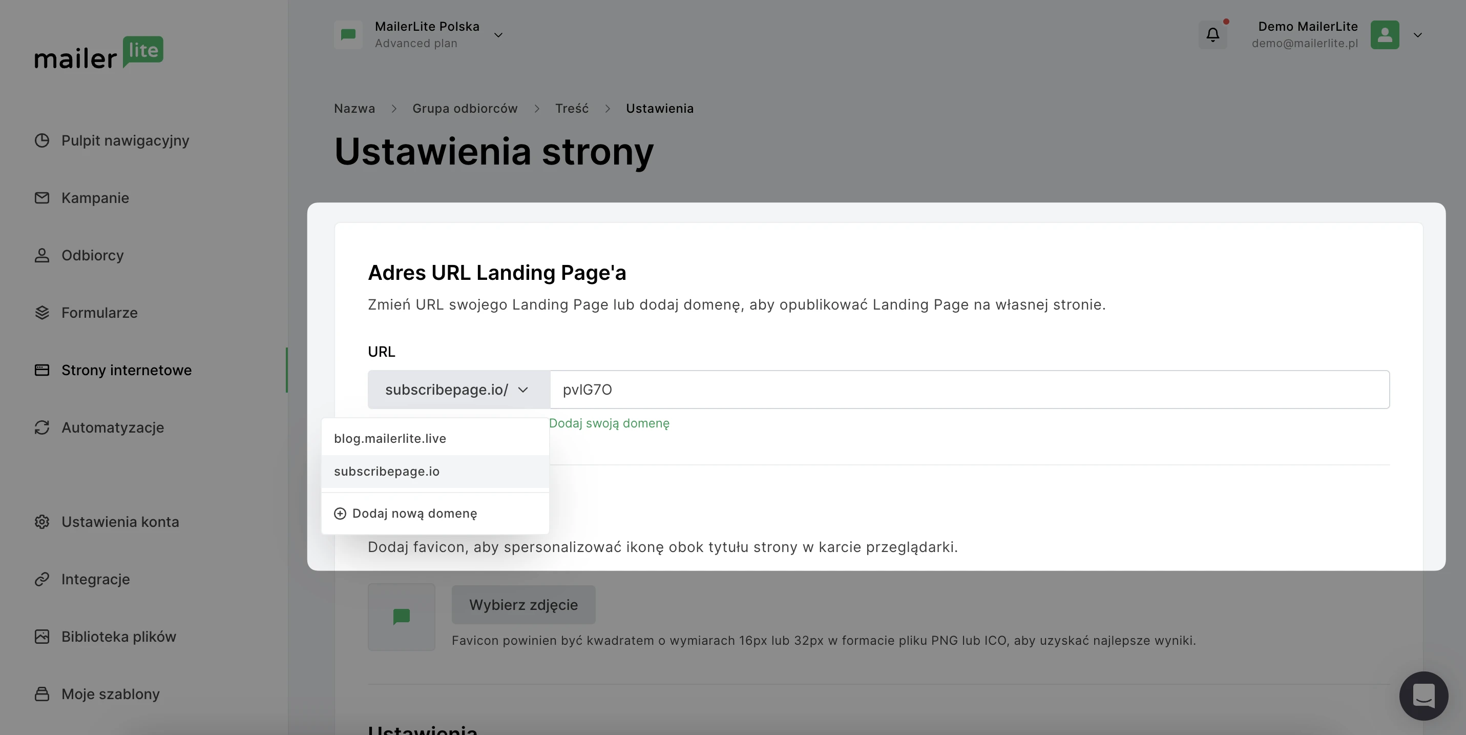 Po utworzeniu landing page’a lub strony internetowej za pomocą kreatora MailerLite, automatycznie generowany jest dla Ciebie losowy adres URL. Na przykład adres URL Twojego landing page’a może wyglądać mniej więcej tak: https://twoja-strona-docelowa.subscribepage.com, a adres URL Twojej strony internetowej może wyglądać jak https://twoja-strona.mailerpage.com.