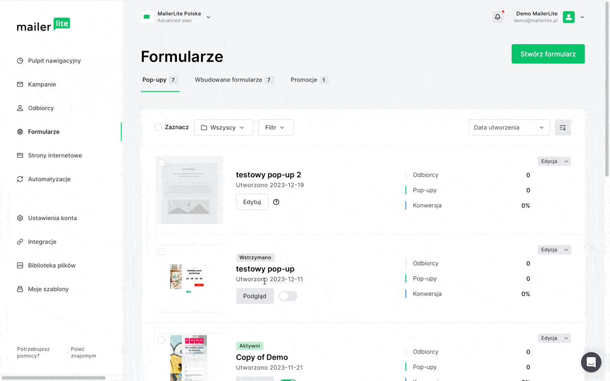 Aby dodać formularz typu pop-up MailerLite do landing page’a lub strony utworzonej w Twoim koncie MailerLite: