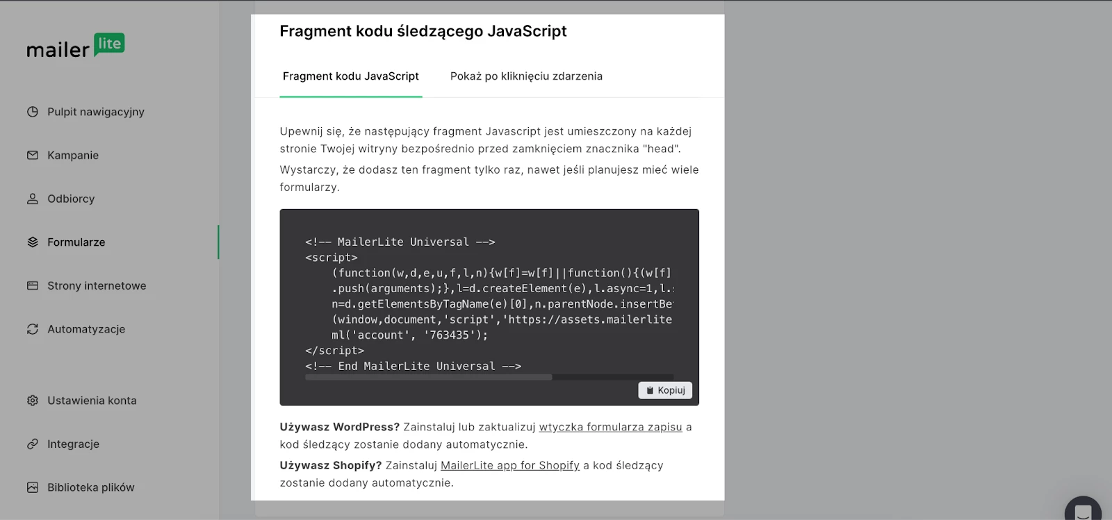 Pierwszy fragment (dłuższa część kodu) to uniwersalny fragment kodu śledzenia MailerLite. Drugi fragment (krótsza część kodu) to indywidualny kod Twojego formularza.