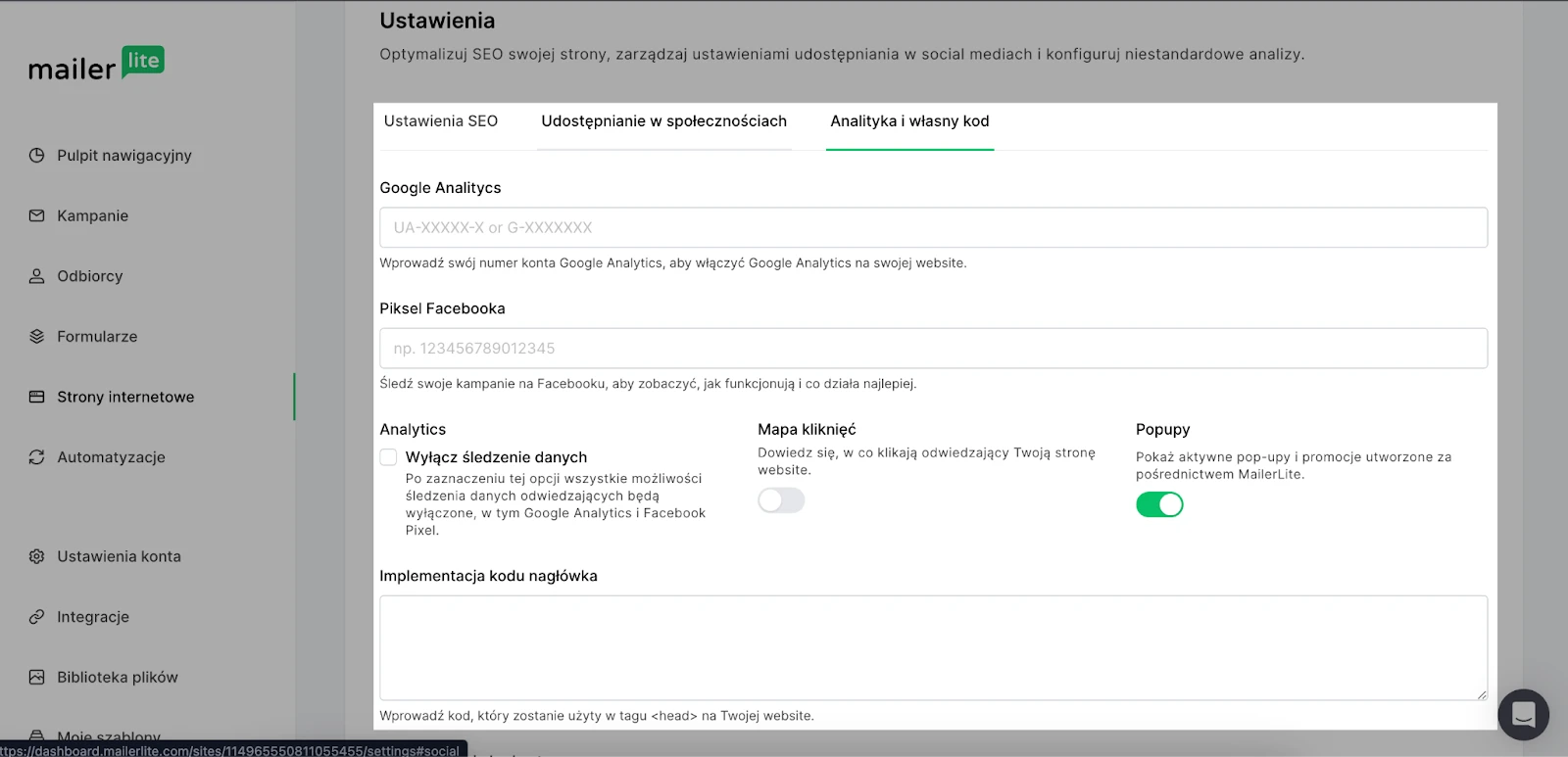4. Skopiuj uniwersalny fragment kodu śledzenia MailerLite i wklej go do kodu HTML Twojej witryny, zaraz przed zamykającym tagiem </head>.