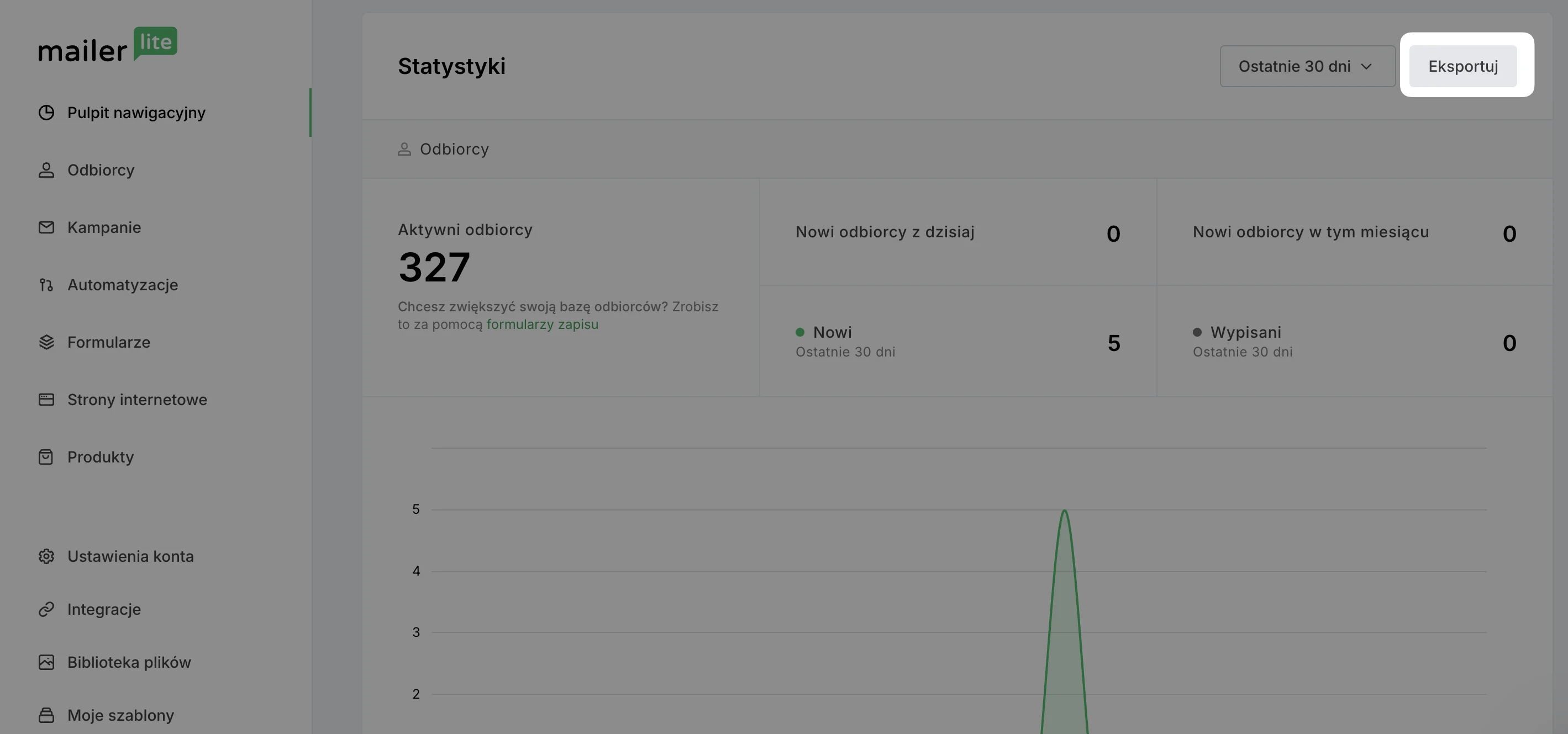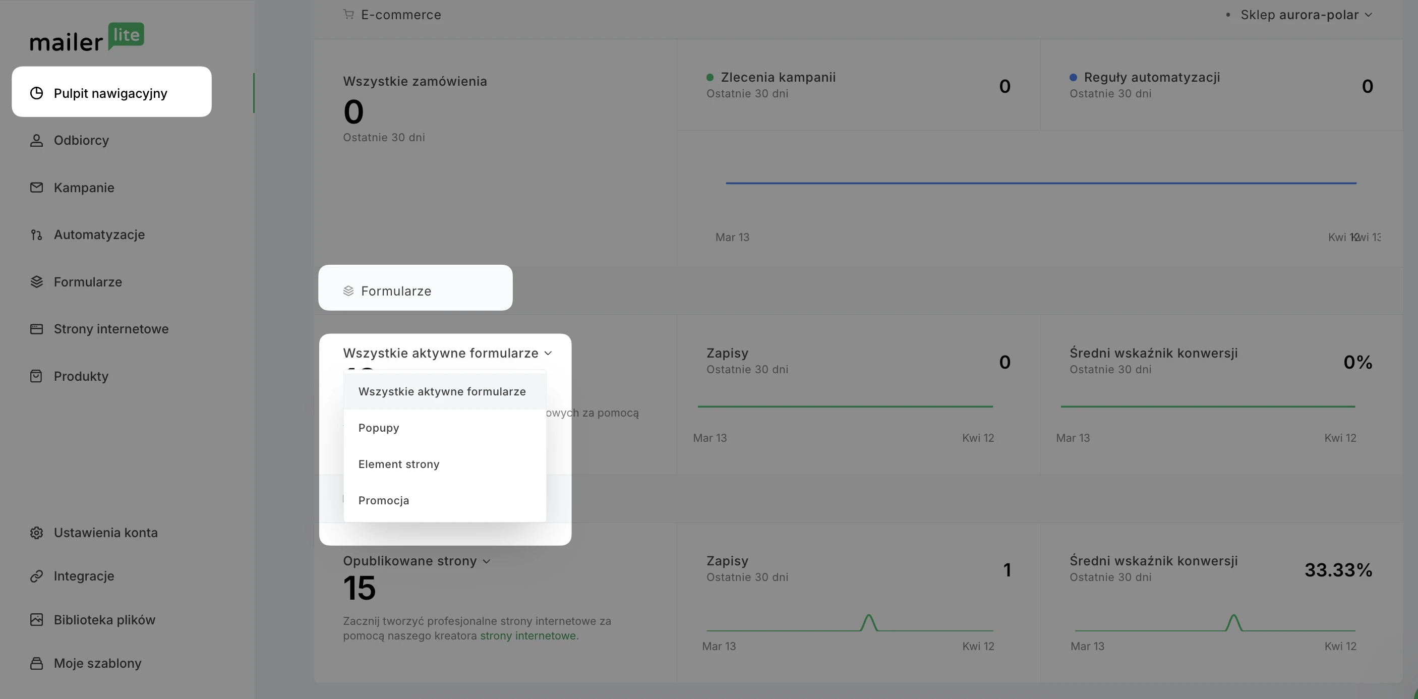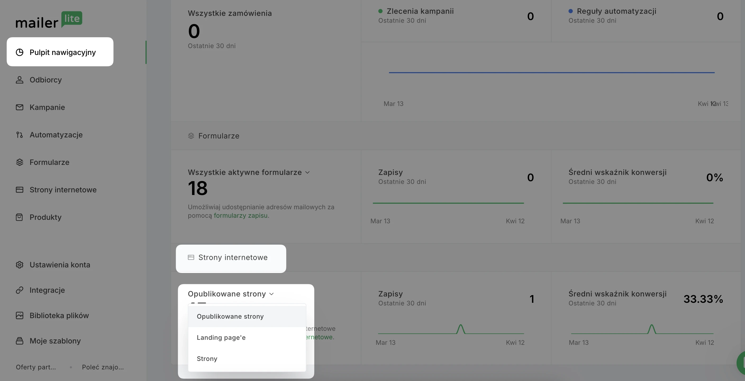 Na pulpicie nawigacyjnym MailerLite znajdziesz podgląd danych dotyczących wszystkich działań MailerLite, w tym: