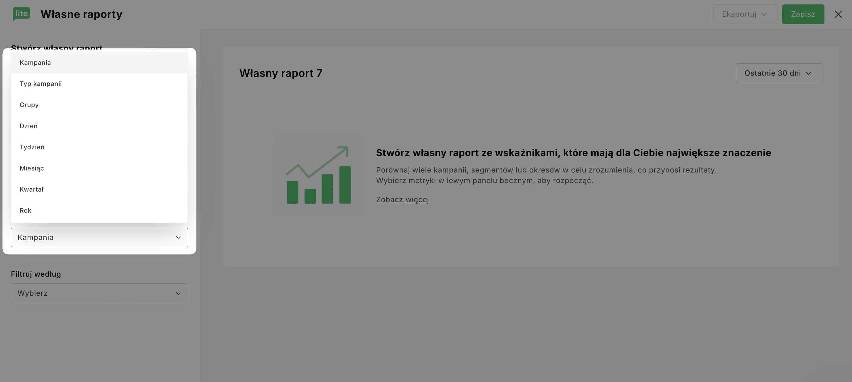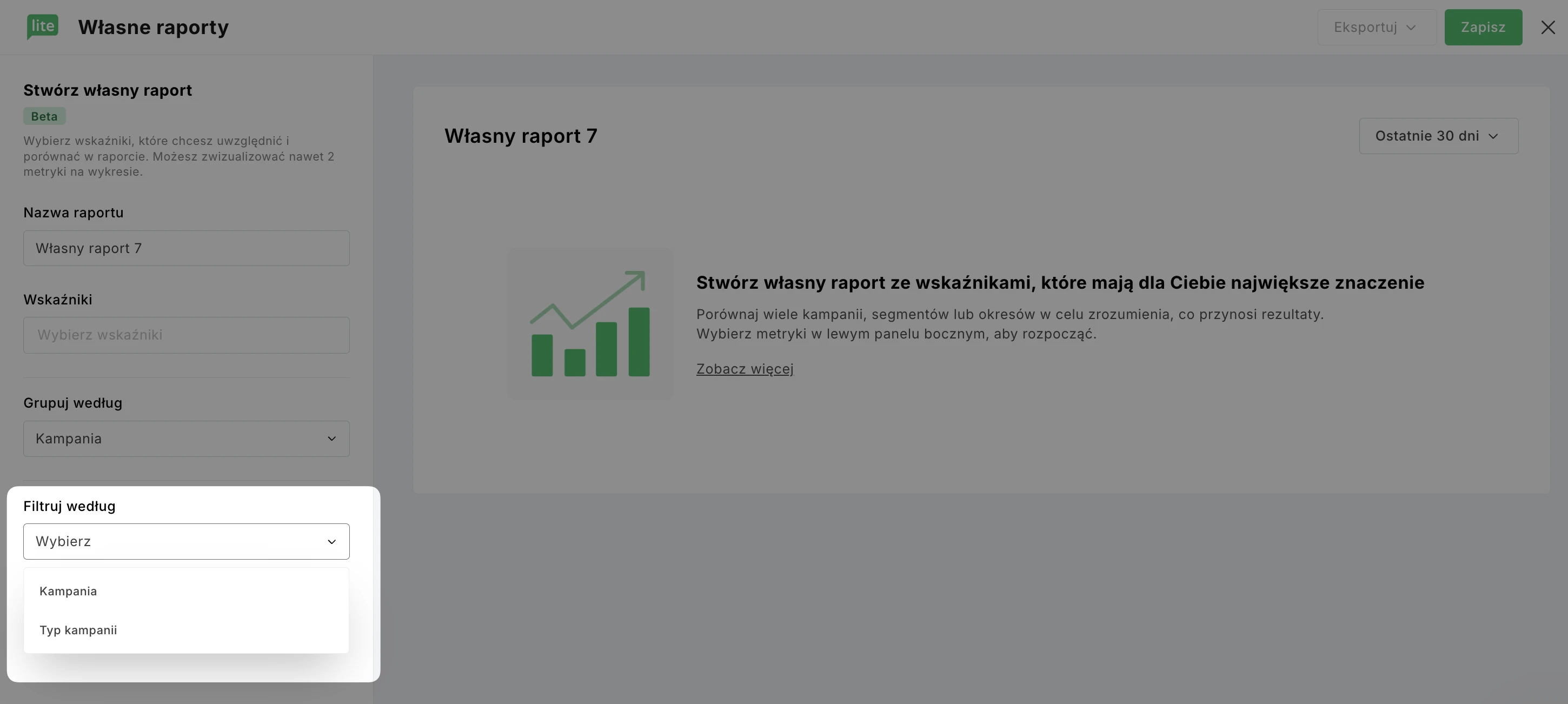 Pod opcjami grupowania znajduje się sekcja Filtruj według. Dzięki niej możesz zawęzić dane do konkretnych kampanii lub segmentów, aby skupić się wyłącznie na tym, co jest istotne dla Twojej analizy.