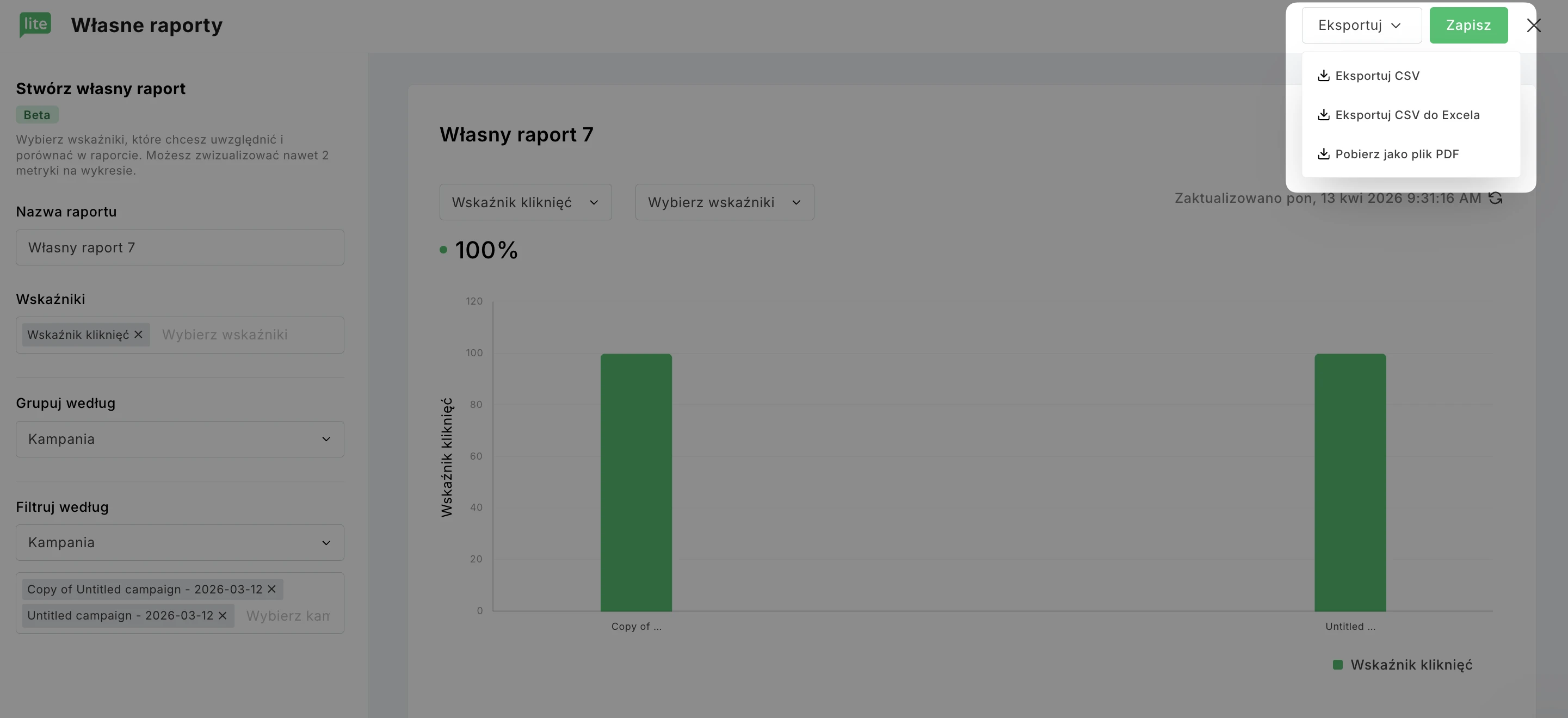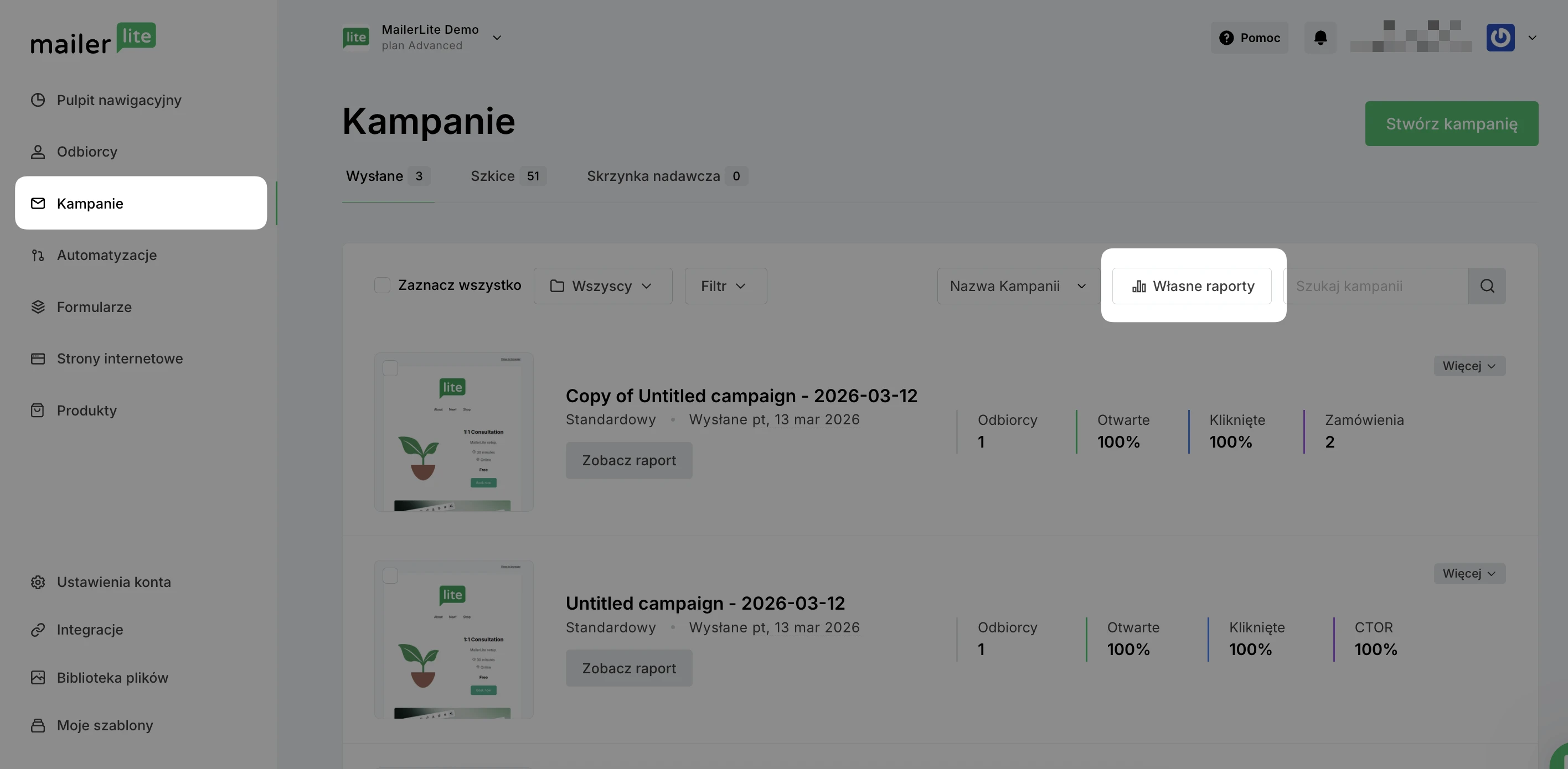 W zakładce Kampanie kliknij opcję Własne raporty.