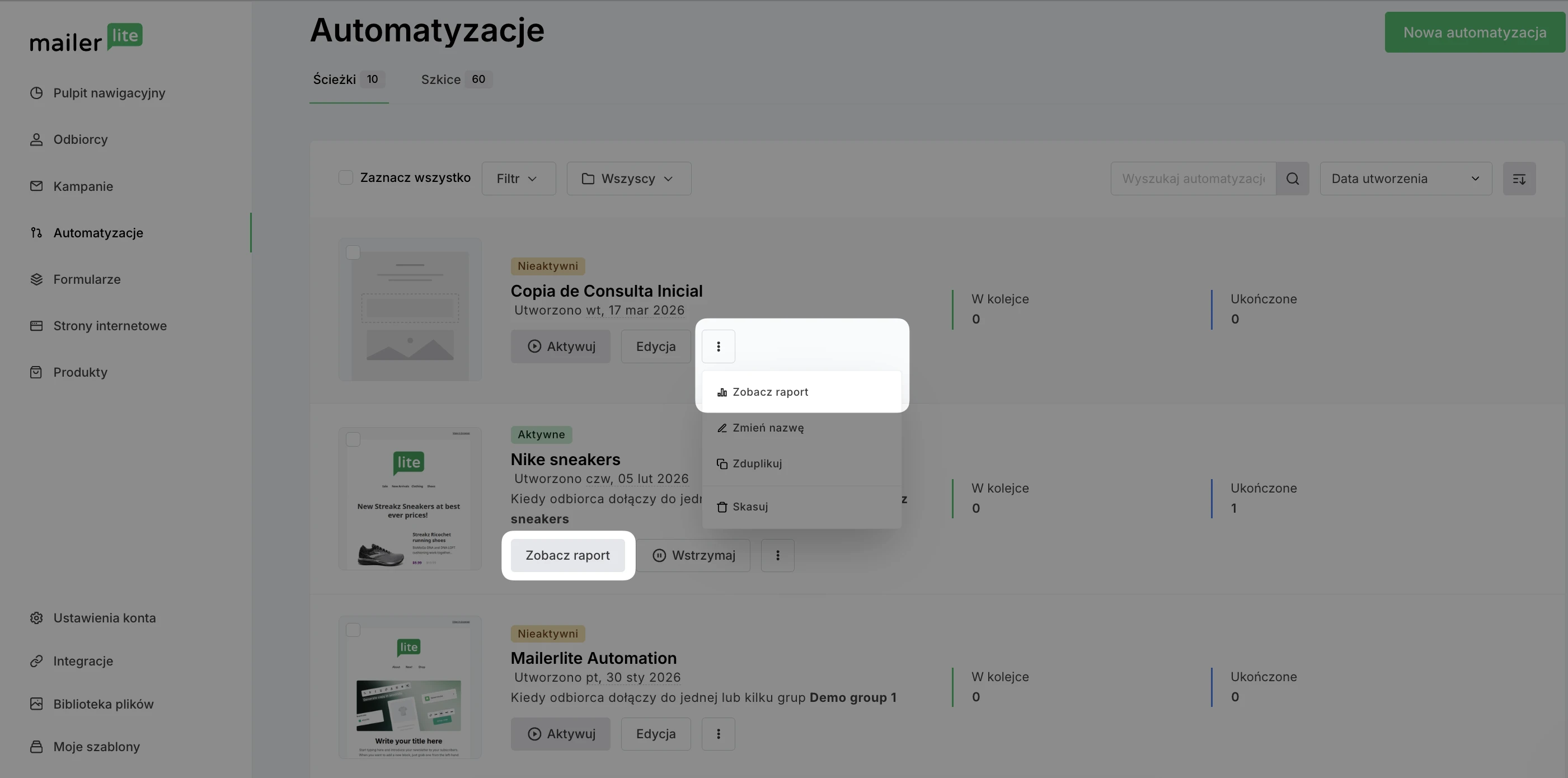 W przypadku nieaktywnych automatyzacji, kliknij trzy kropki i opcję Zobacz raport. W przypadku aktywnych automatyzacji, kliknij Zobacz raport.