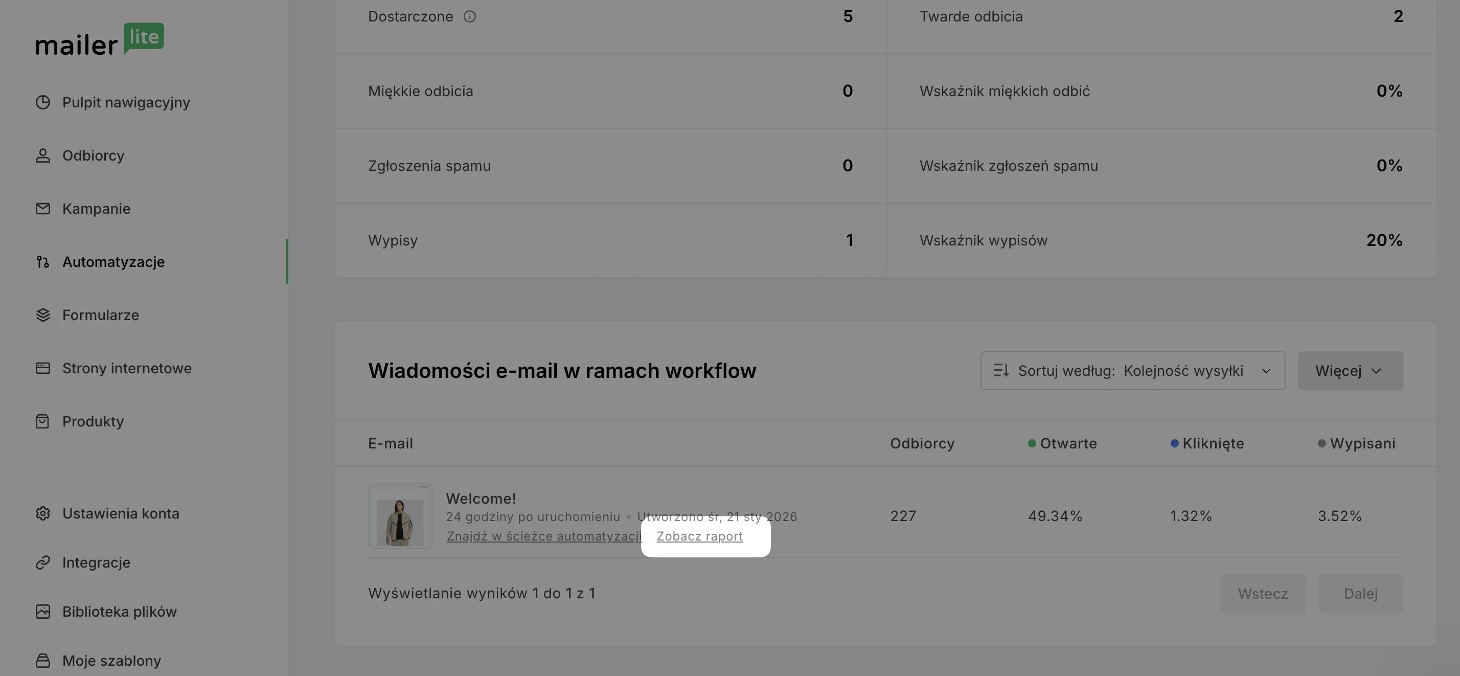 Spowoduje to otwarcie raportu dla tej konkretnej wiadomości e-mail workflow.