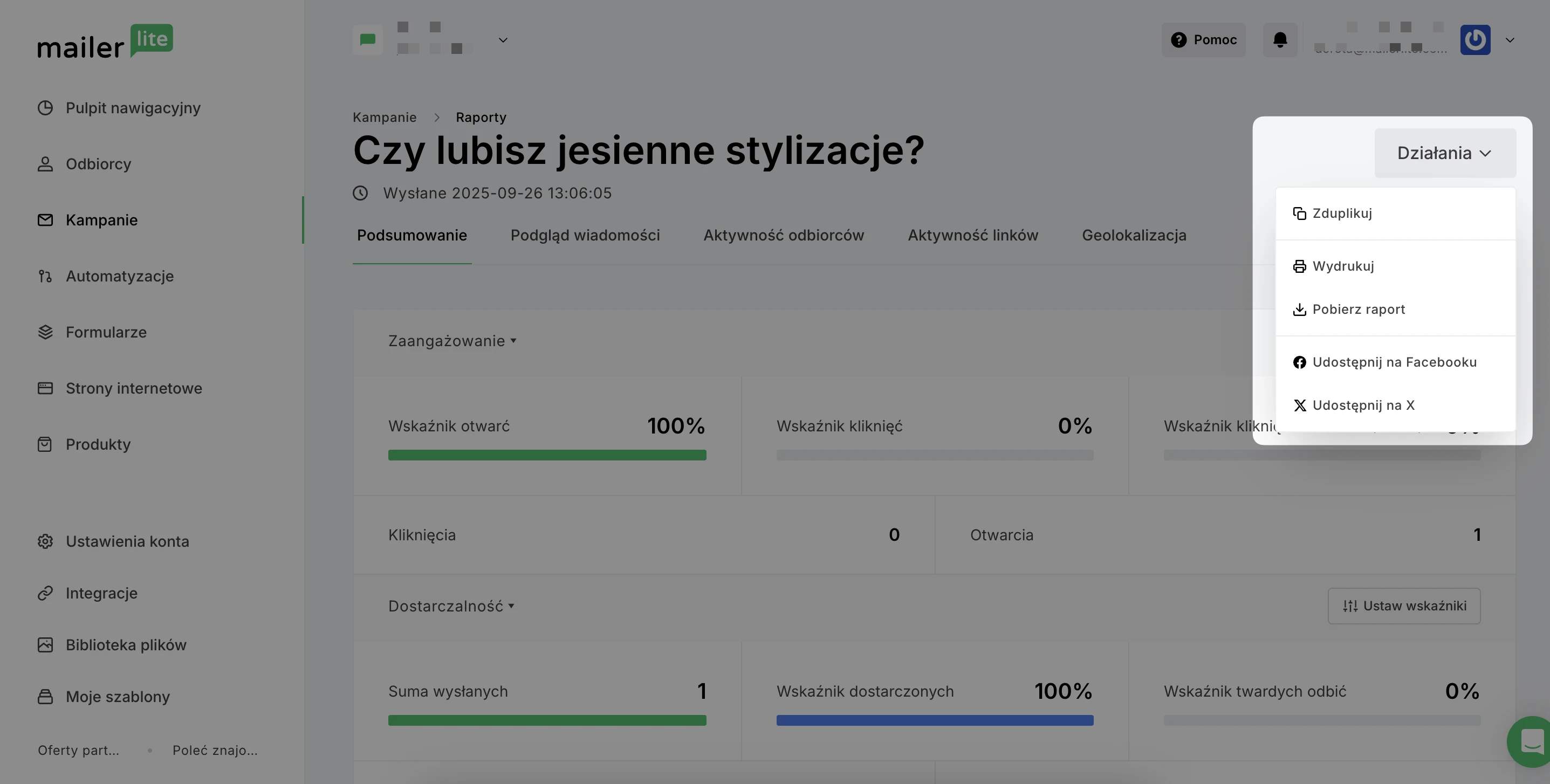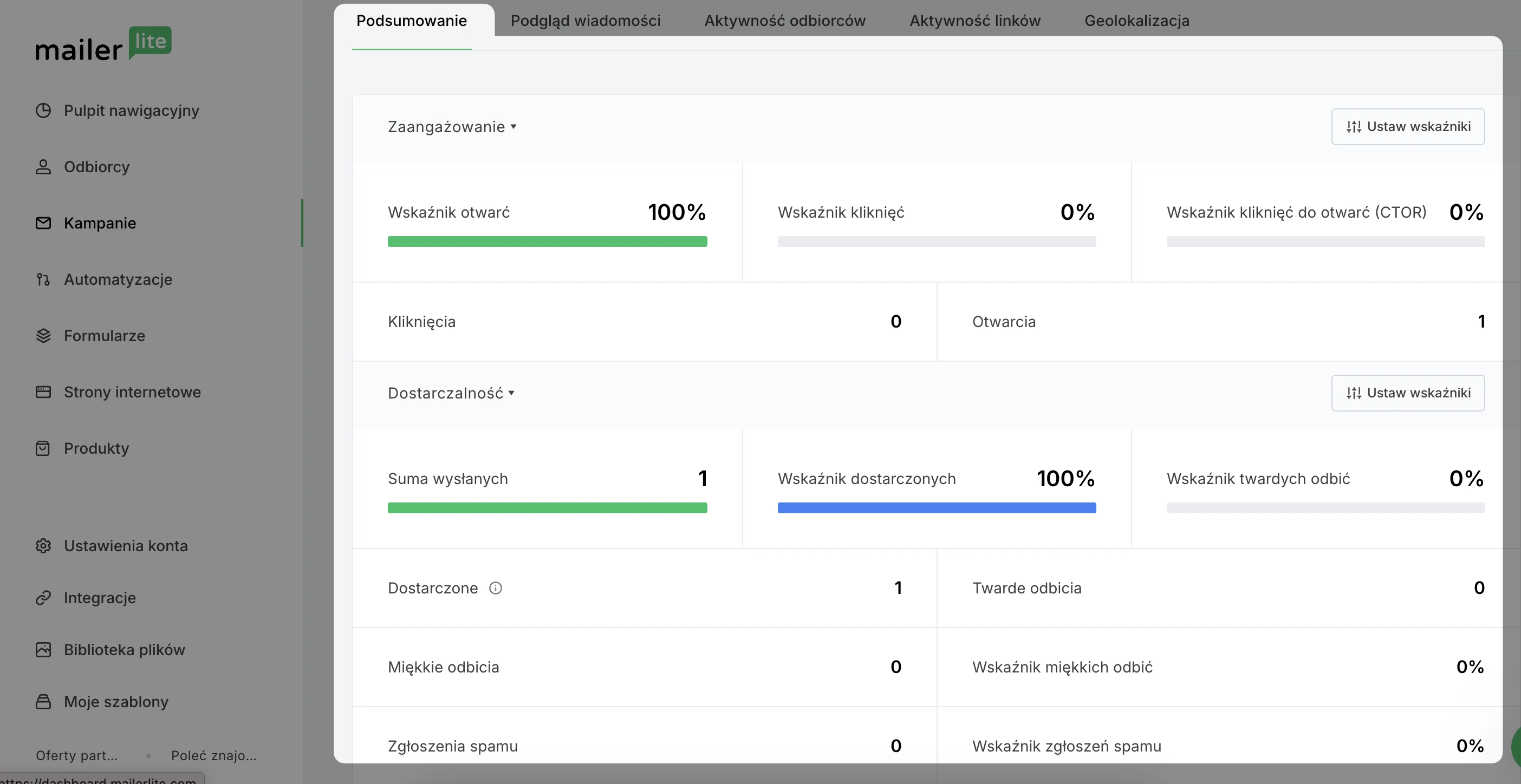 Zakładka Podsumowanie jest miejscem, w którym znajdziesz swój główny raport z przeprowadzonej kampanii. Od razu zobaczysz datę i godzinę wysłania maila, a następnie statystyki kampanii. Statystyki, które tu znajdziesz to: