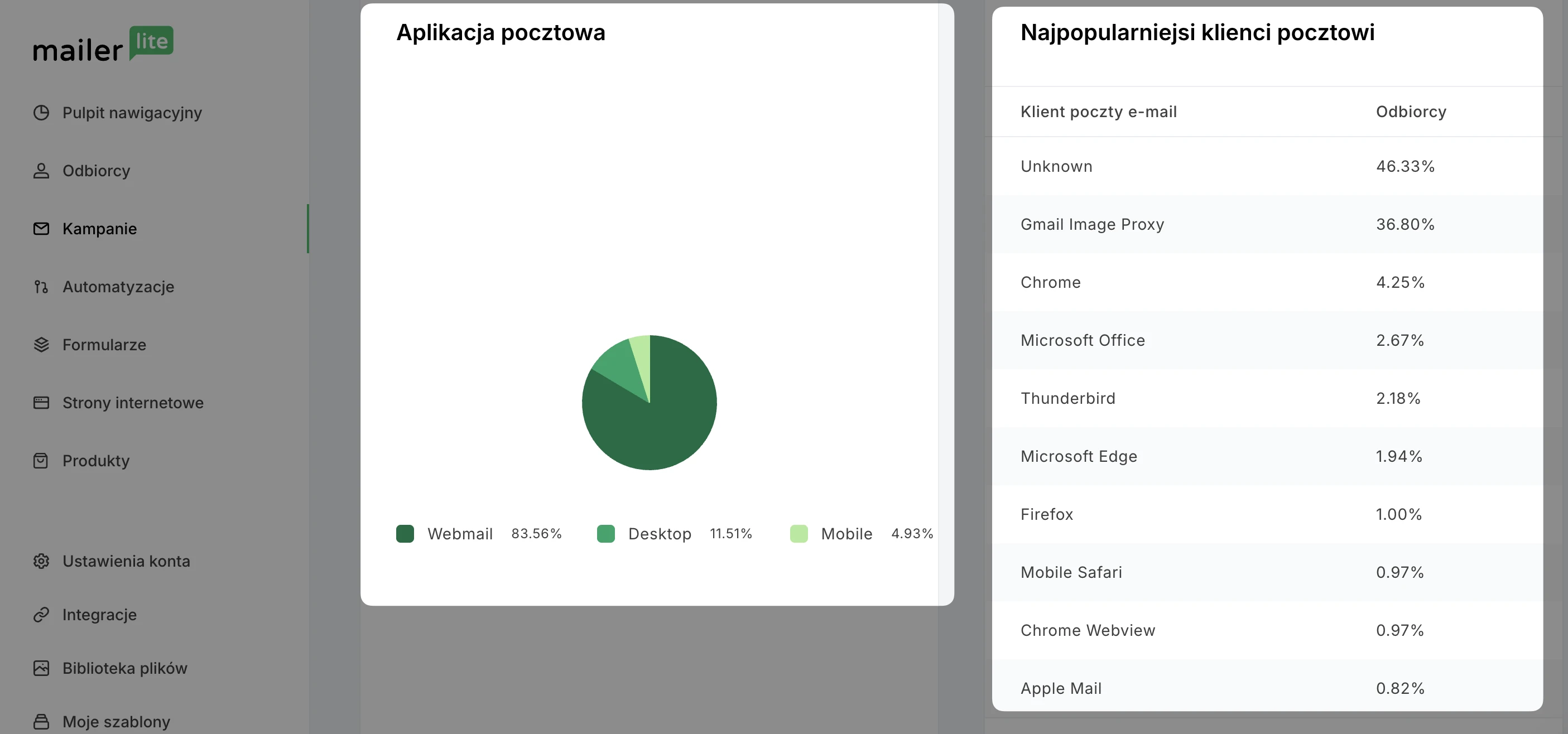 Możesz również znaleźć najczęstsze aplikacje pocztowe używane przez Twoich subskrybentów w sekcji Najpopularniejsi klienci pocztowi..