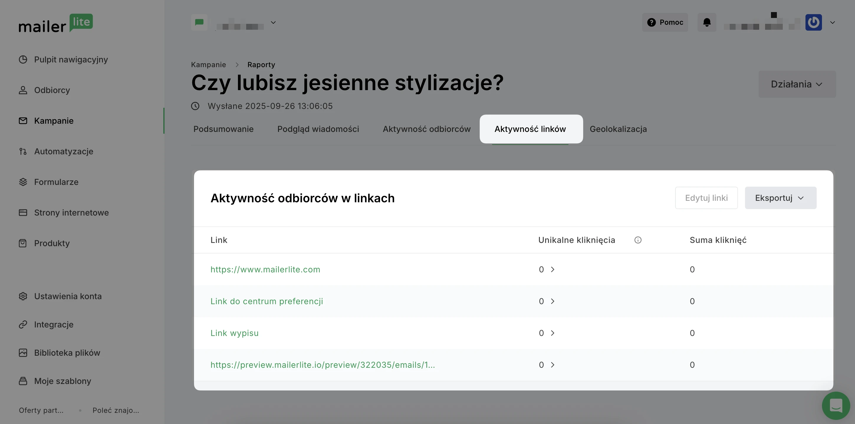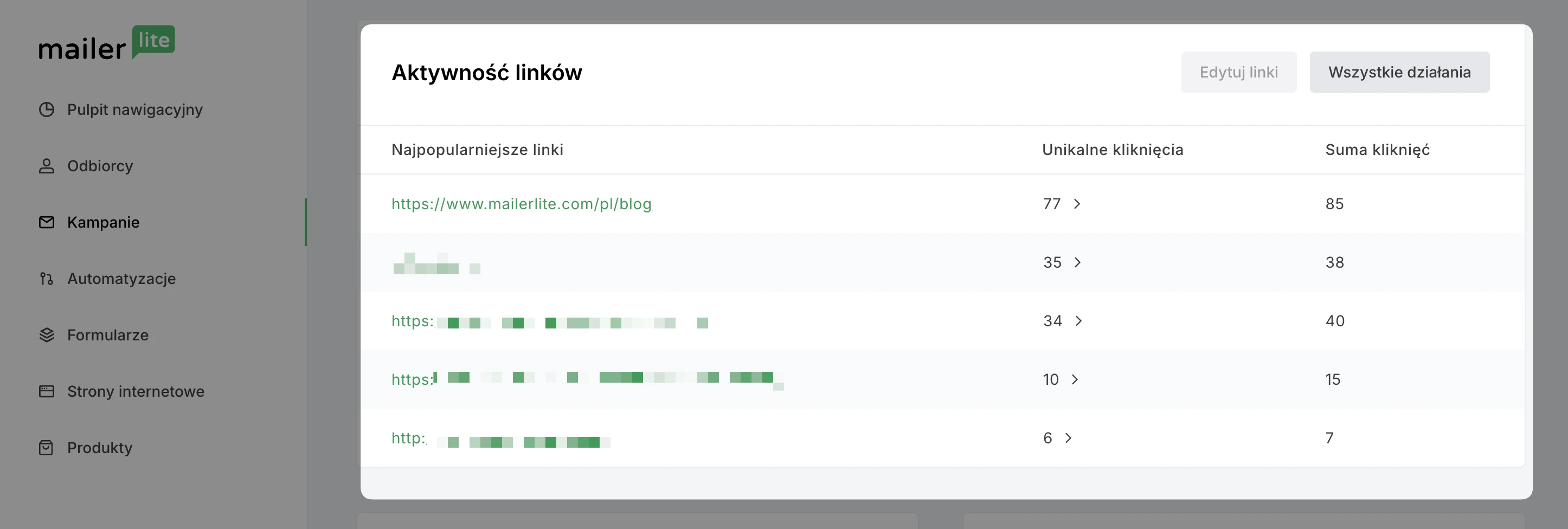 W zakładce Aktywność linków zobaczysz listę linków uwzględnionych w kampanii wraz z łączną liczbą kliknięć dla każdego z nich, a także liczbę unikalnych kliknięć dla poszczególnych linków.