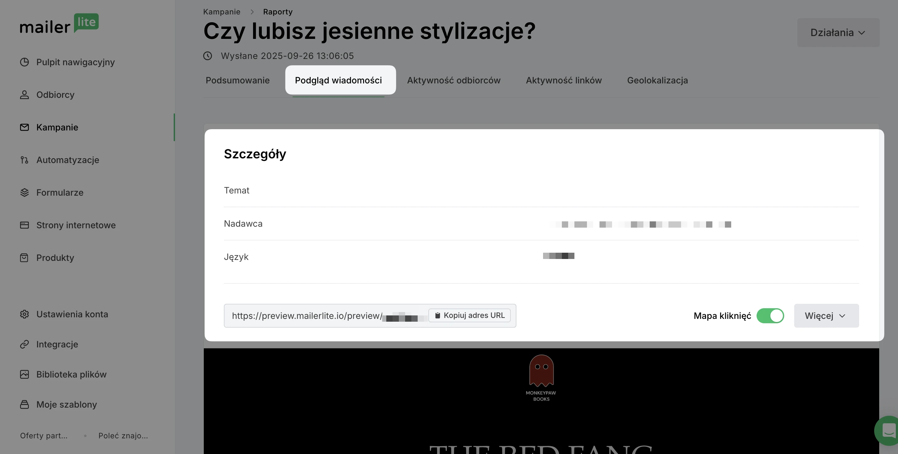 Poniżej tematu i informacji o nadawcy możesz włączyć lub wyłączyć mapę kliknięć. Mapa kliknięć to podgląd Twojego newslettera, który podkreśla każdy obszar, który został kliknięty przez Twoich subskrybentów. Możesz zobaczyć, jaki procent kliknięć należy do poszczególnych linków.