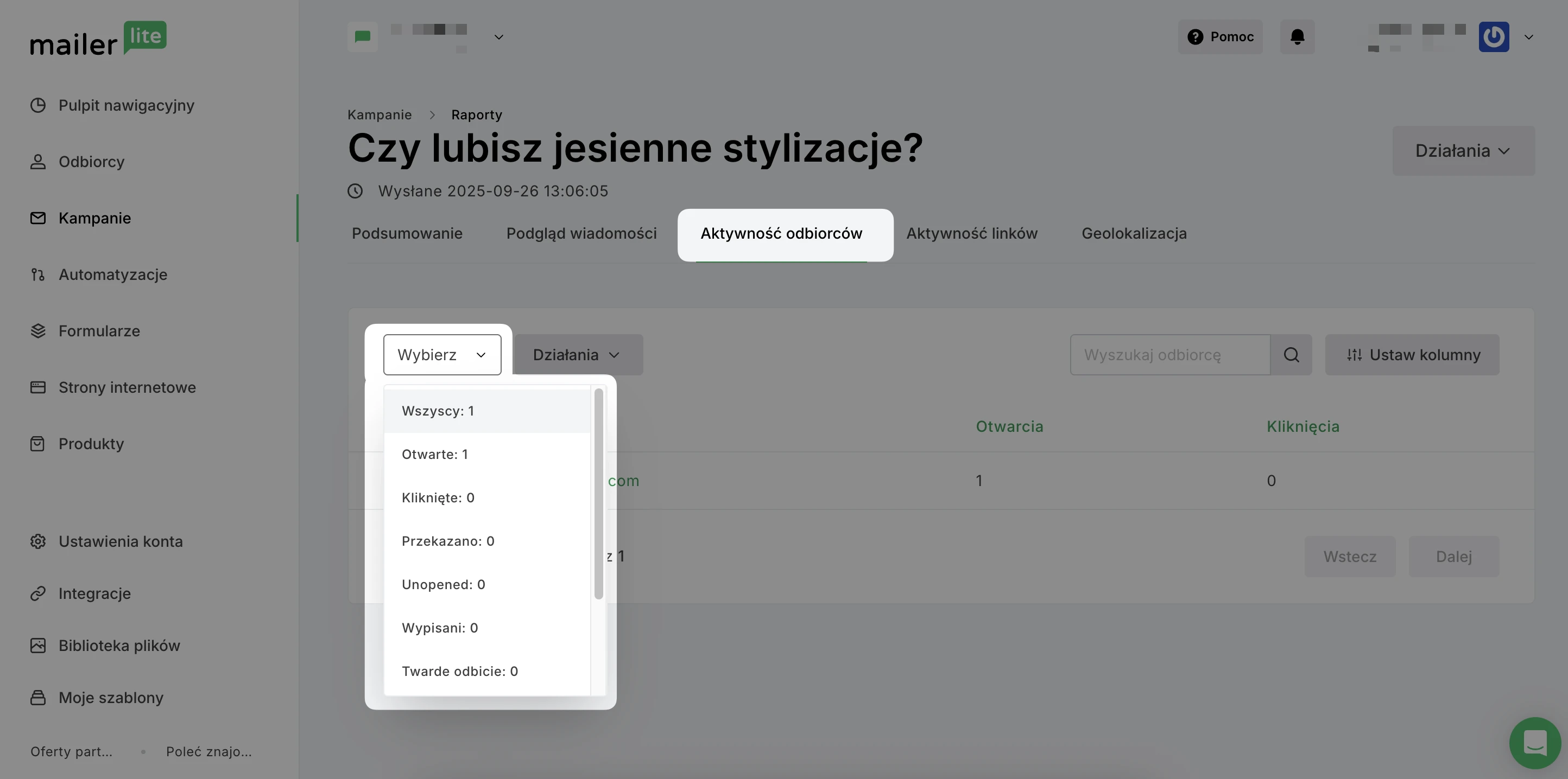 W zakładce Aktywność odbiorców znajdziesz listę subskrybentów, którzy otrzymali Twoją kampanię wraz z łączną liczbą otwarć i kliknięć tej kampanii.