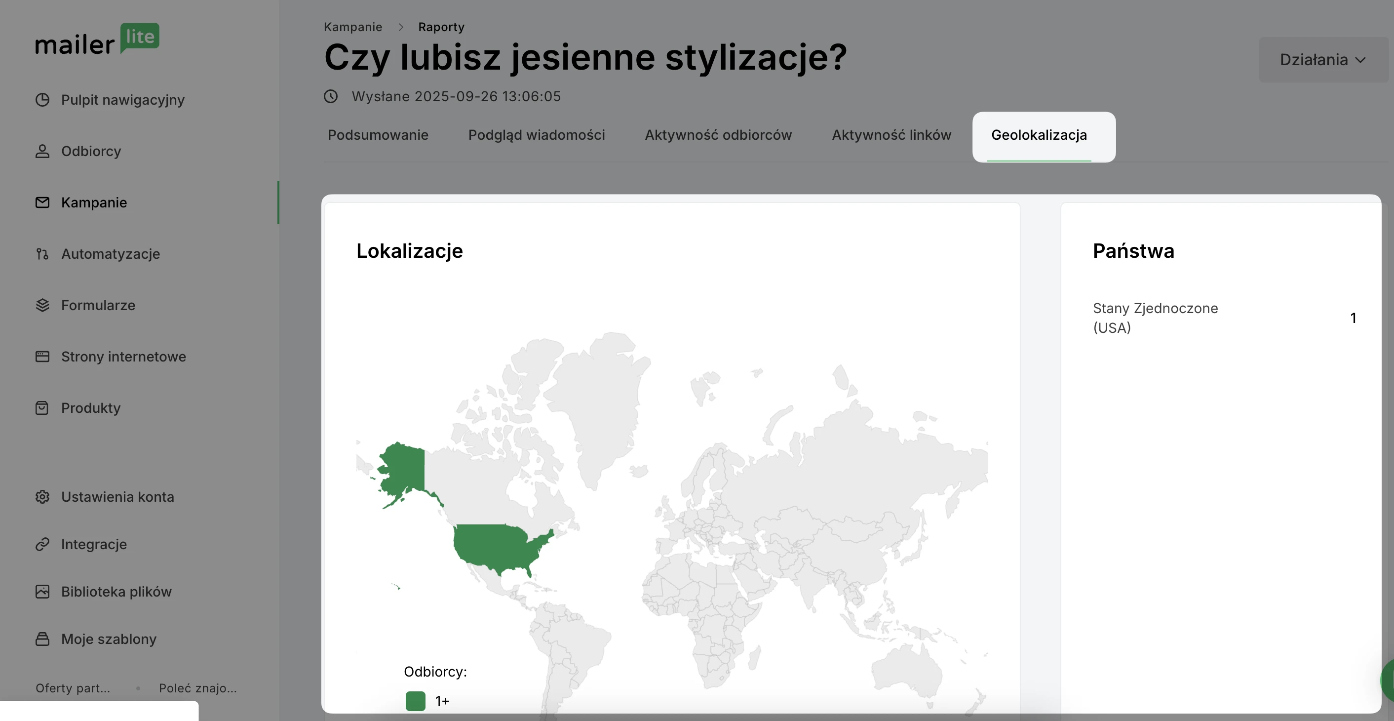 W zakładce Geolokalizacja znajdziesz mapę, która wskazuje, gdzie na świecie Twoi subskrybenci otworzyli i przeczytali Twoją wiadomość. Aby uzyskać więcej informacji na temat analizy tych danych, zobacz jak sprawdzić otwarcia według lokalizacji.
