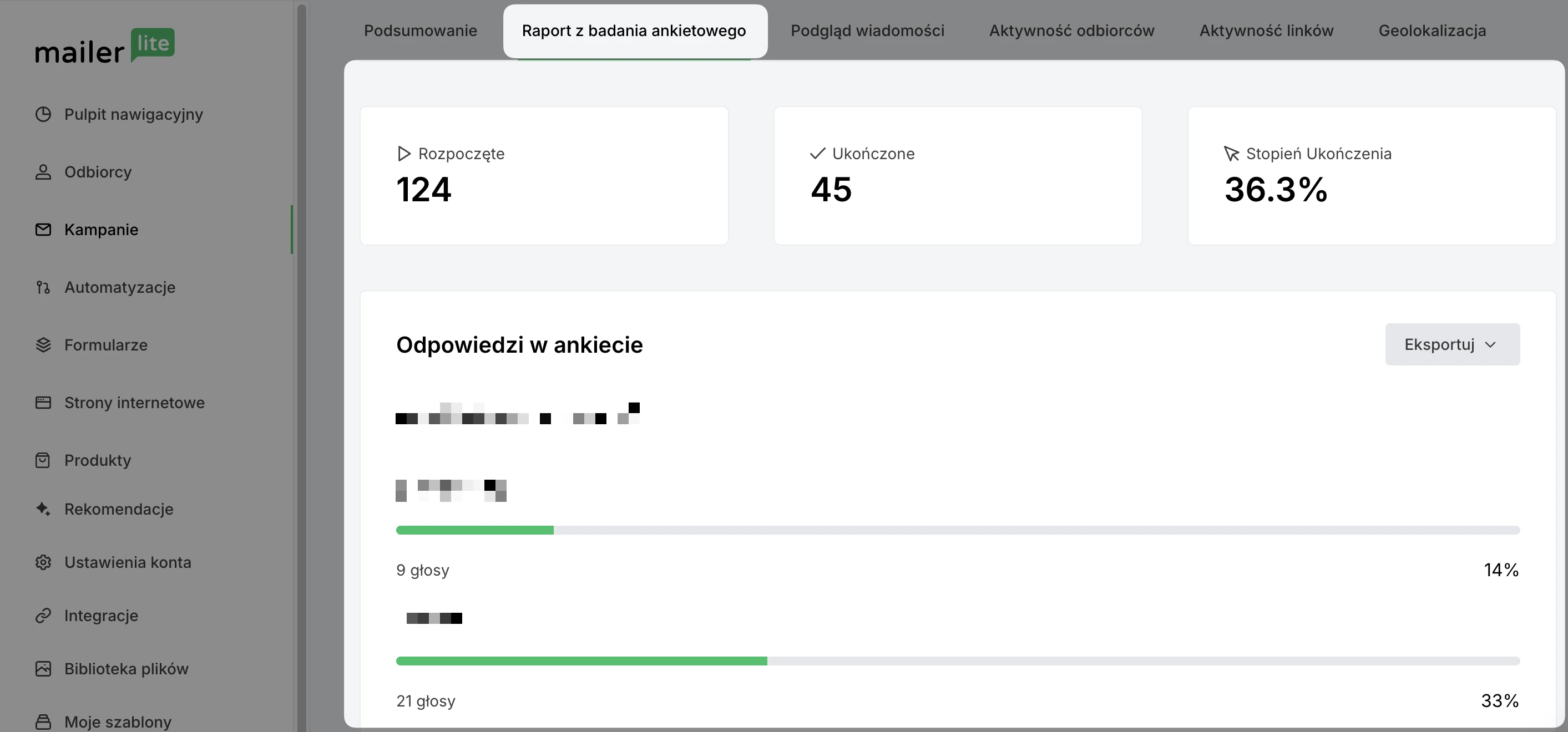 Zakładka Raport z badania ankietowego pojawi się tylko wtedy, gdy w Twojej kampanii został umieszczony blok Ankieta. Znajdziesz tu raport z zaangażowania w ankietę, a także listę odpowiedzi.