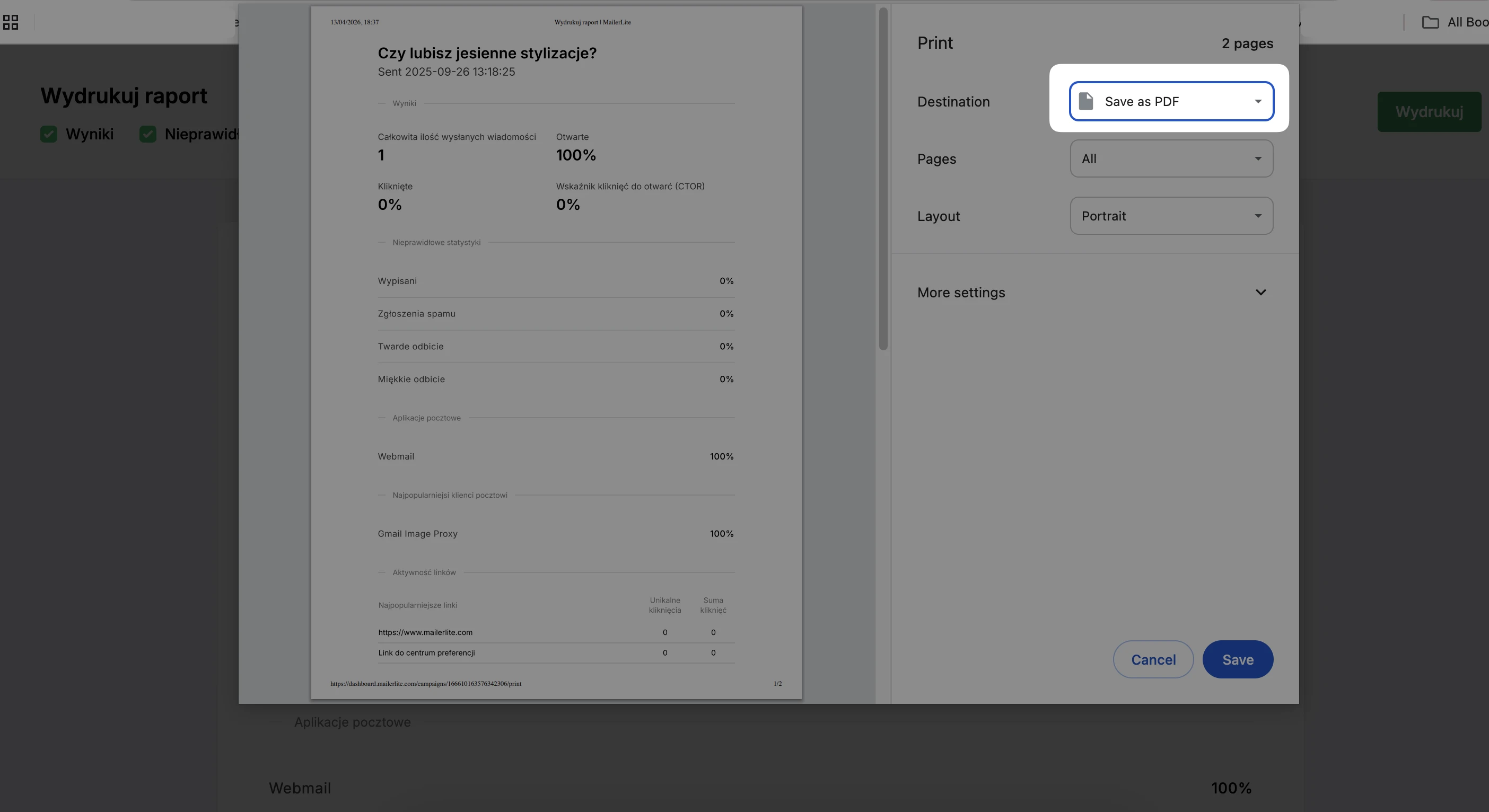 W sekcji Miejsce docelowe wybierz opcję Zapisz jako PDF (Save as PDF).