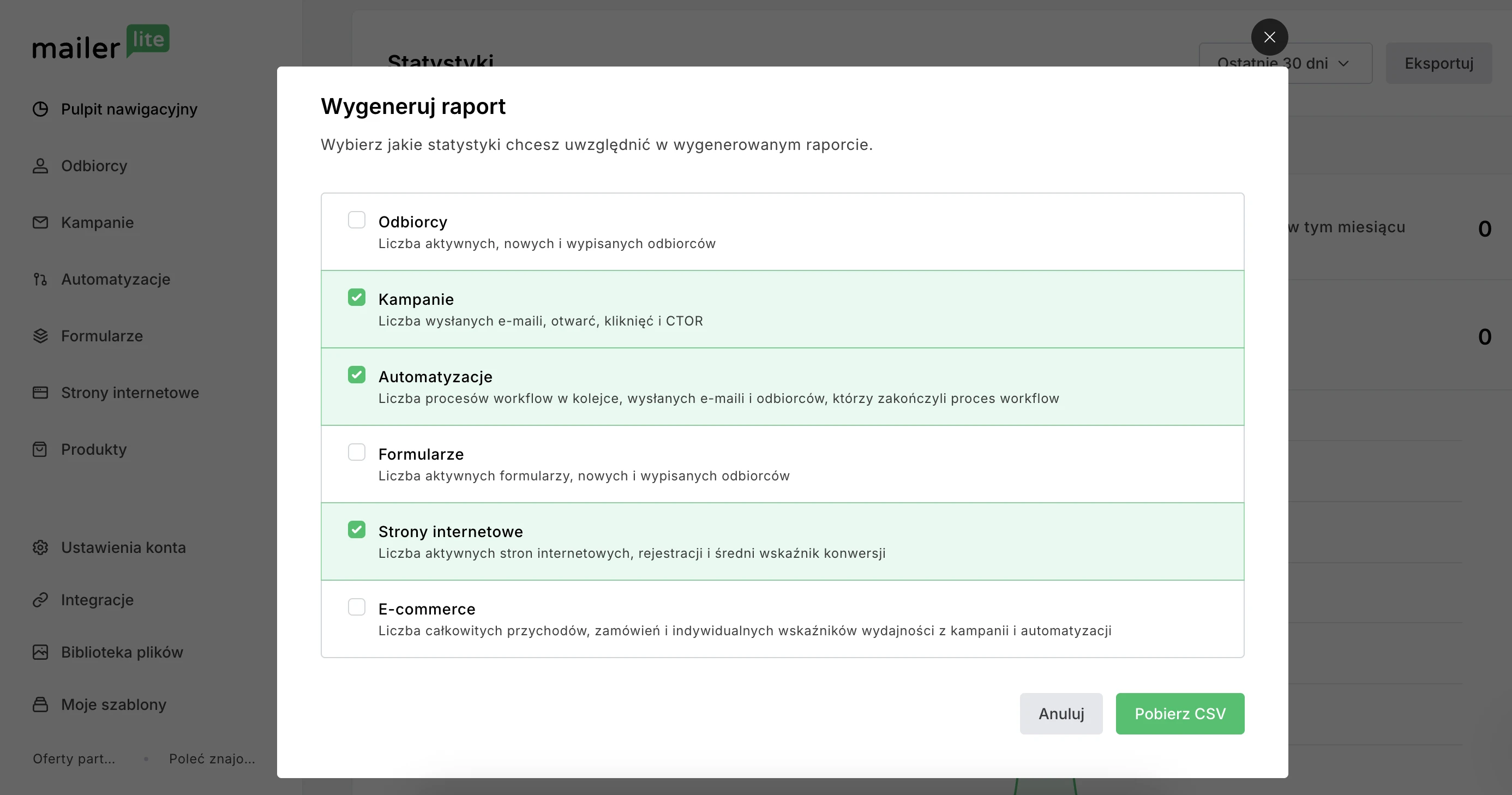 3. Wybierz statystyki, które chcesz uwzględnić w wygenerowanym raporcie.