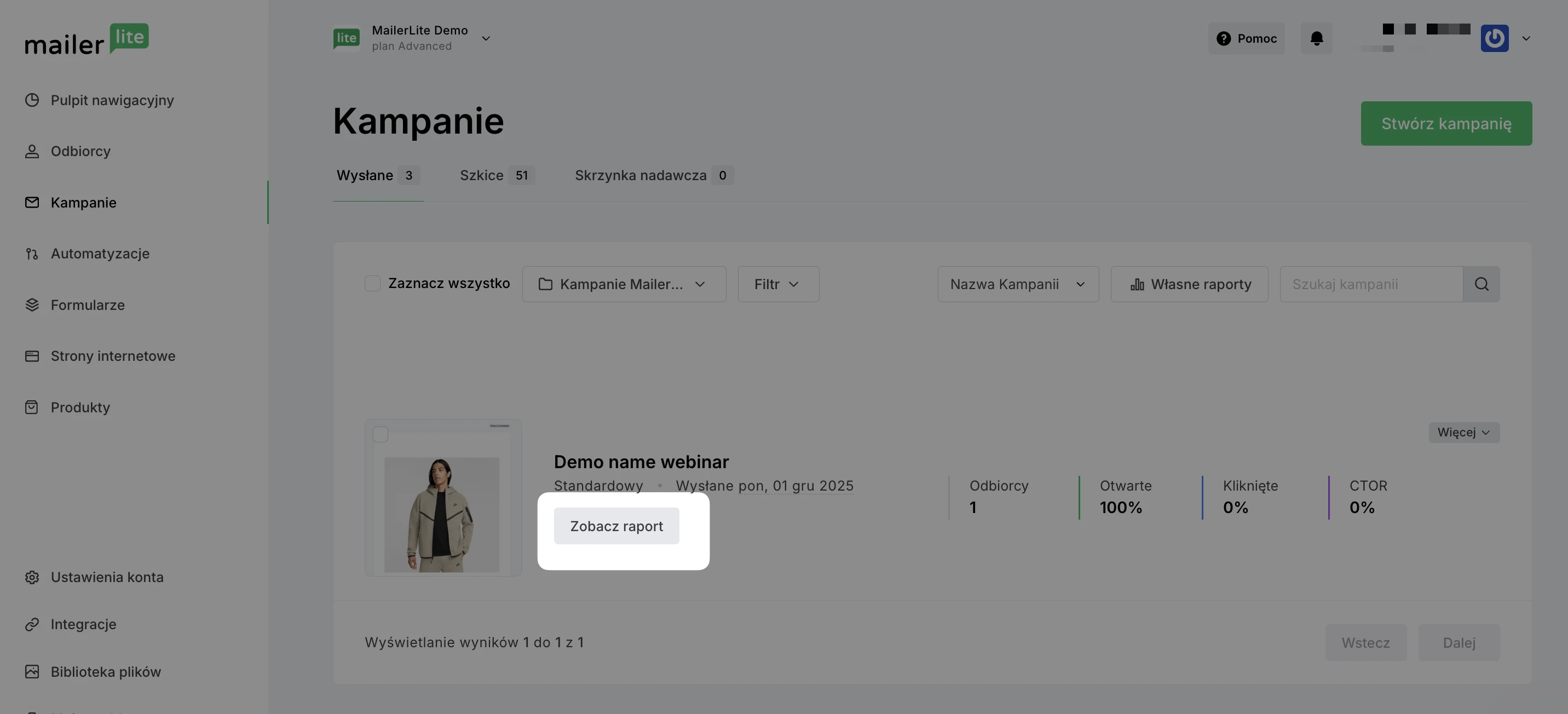 Znajdź kampanię, której raport chcesz przejrzeć.