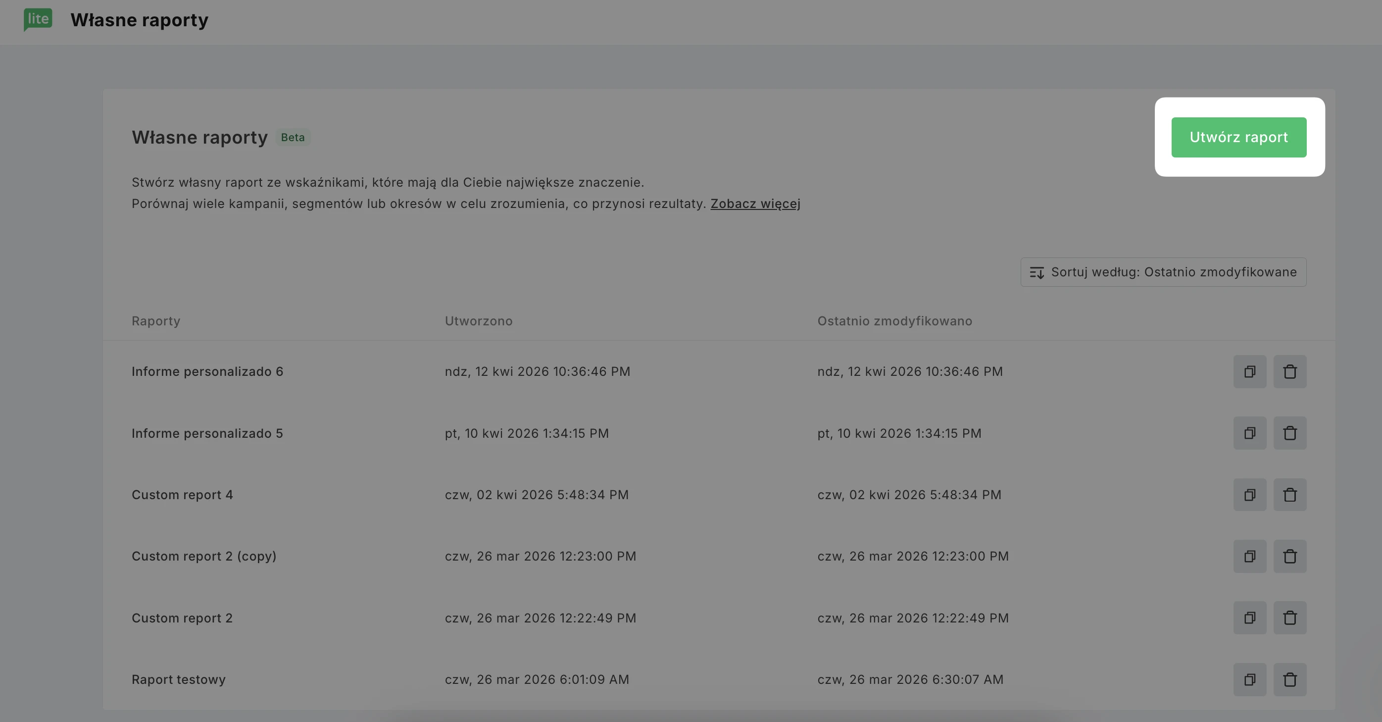 Funkcja własnych raportów pozwala tworzyć elastyczne, bogate w dane raporty dostosowane do konkretnych celów. Zamiast polegać na statycznych analizach, możesz wyświetlać, segmentować i eksportować dane w sposób ułatwiający wyciągnięcie wniosków i podejmowanie odpowiednich działań.