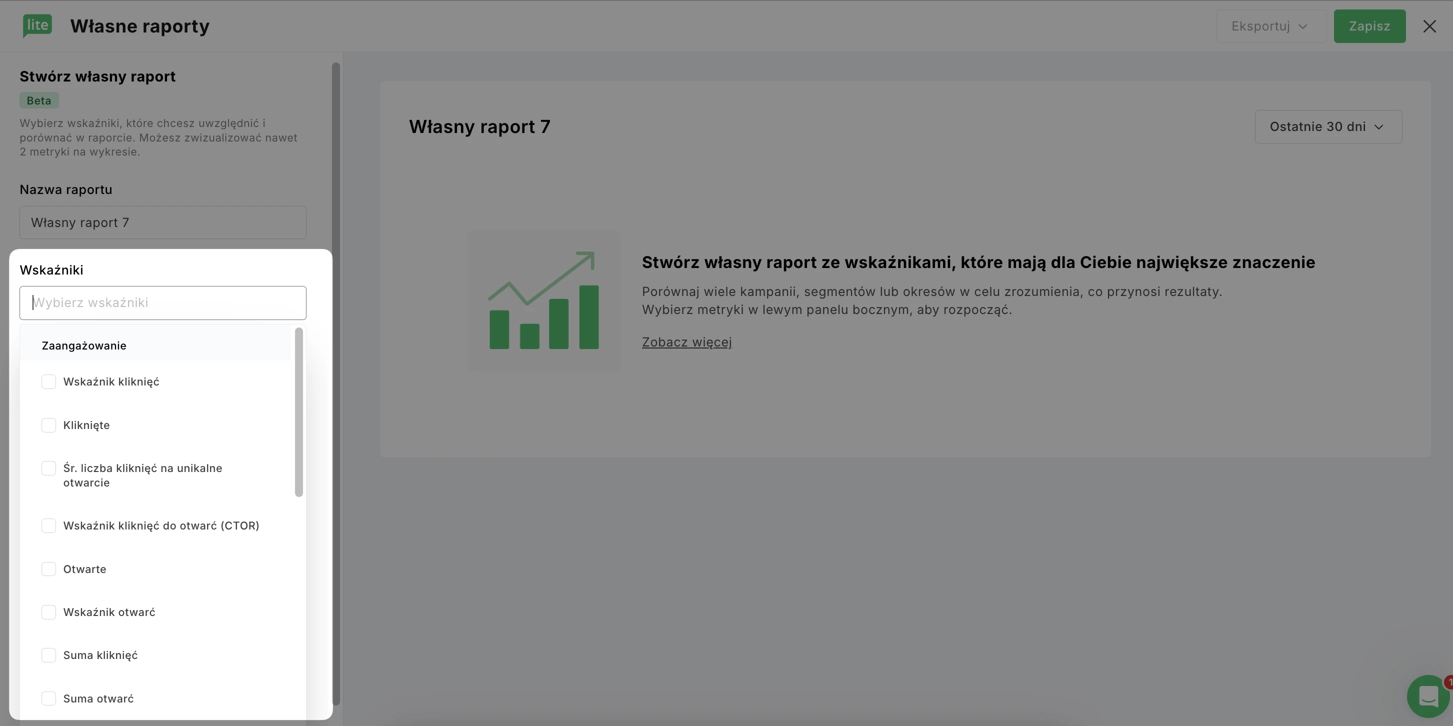 Nadaj nazwy swojemu raportowi i wybierz wskaźniki, które chcesz przeanalizować.