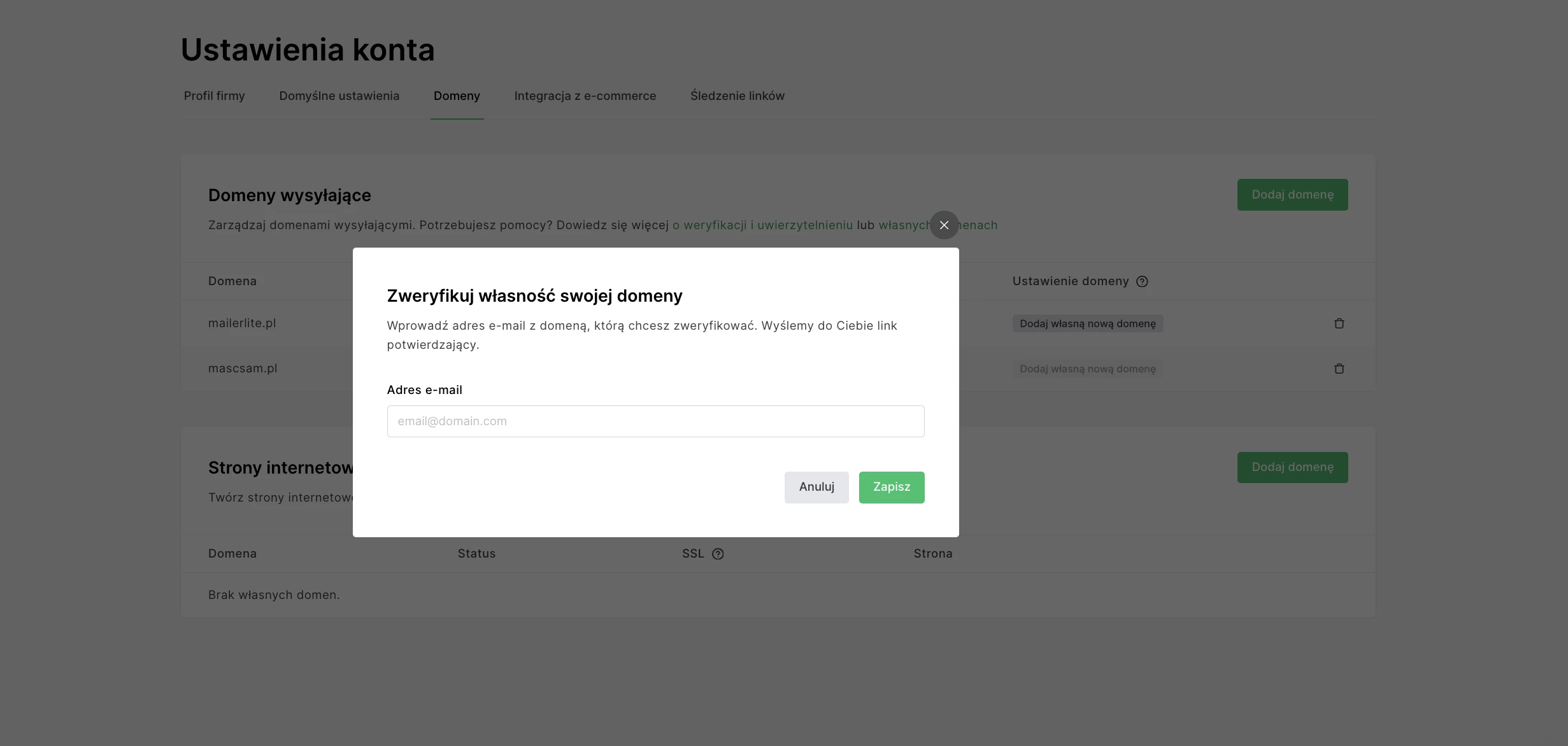 Aby sprawdzić, czy dodajesz domenę, której jesteś właścicielem, wprowadź adres e-mail zawierający Twoją płatną domenę, która będzie używana do wysyłania kampanii.