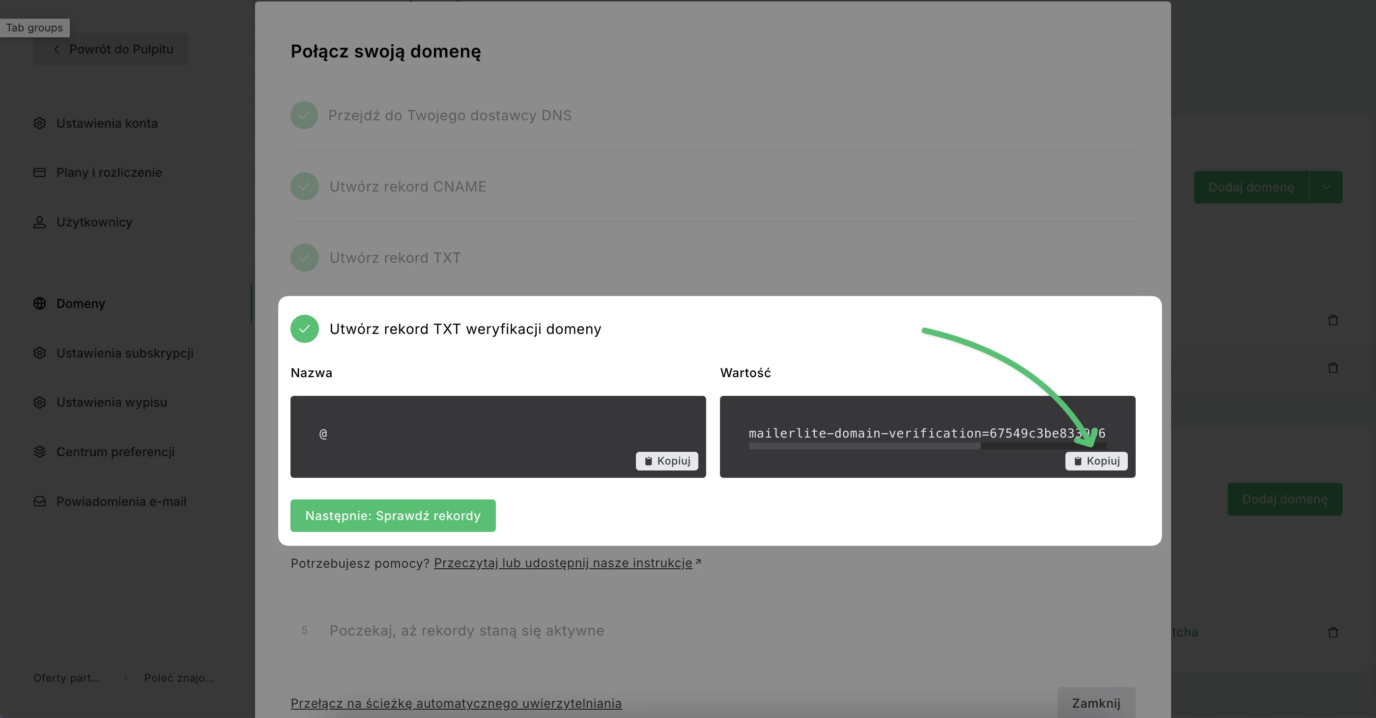 6. Wróć do panelu MailerLite, do wcześniej wyświetlanego kroku “Utwórz rekord TXT weryfikacji domeny” i skopiuj wartość rekordu TXT.