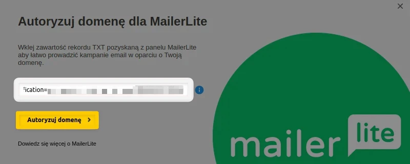 Pamiętaj, że aby uwierzytelnić swoją domenę dla MailerLite w panelu cyber_Folks, wystarczy dodać rekord TXT. Po jego dodaniu, rekordy DKIM i SPF zostaną skonfigurowane automatycznie.