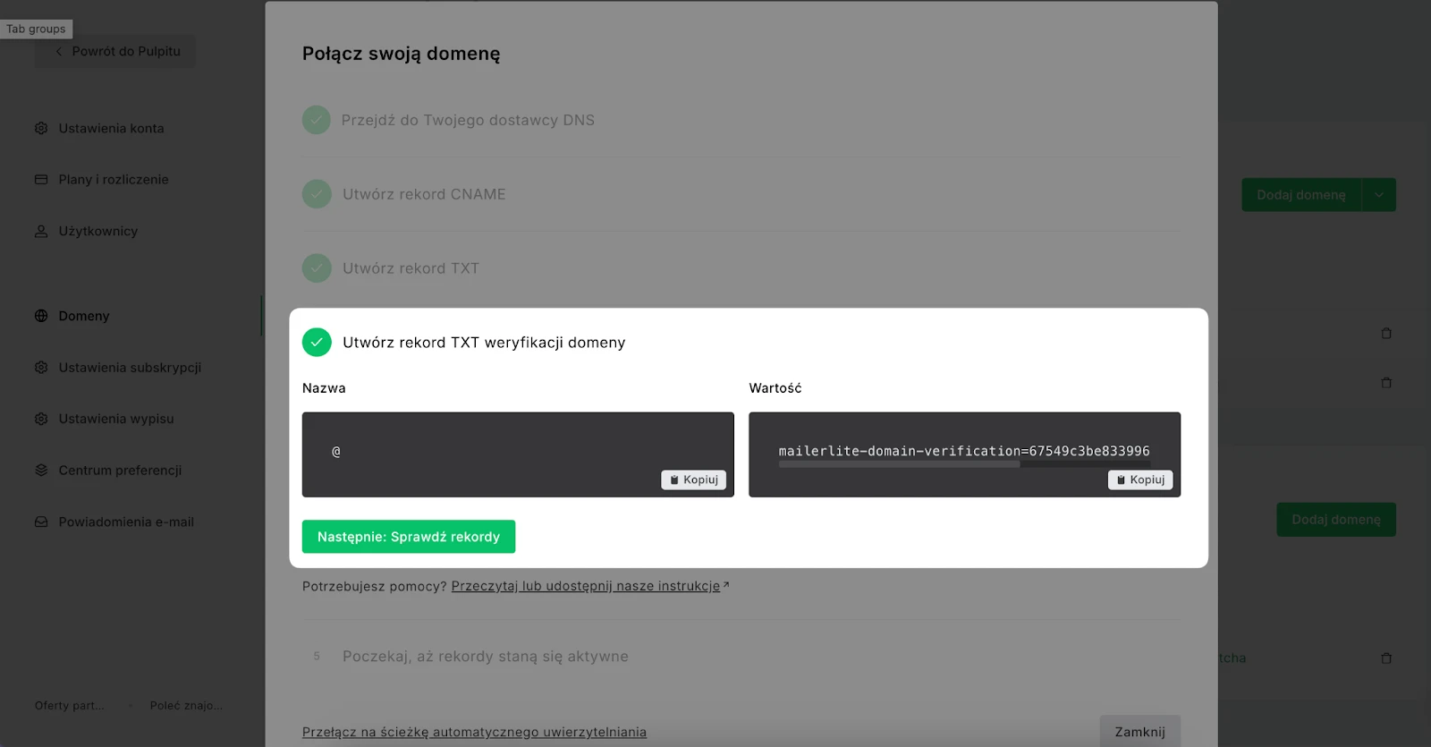 8. Wróć do panelu MailerLite, do wcześniej wyświetlanego kroku Utwórz rekord TXT weryfikacji domeny i kliknij przycisk Następnie: Sprawdź rekordy.