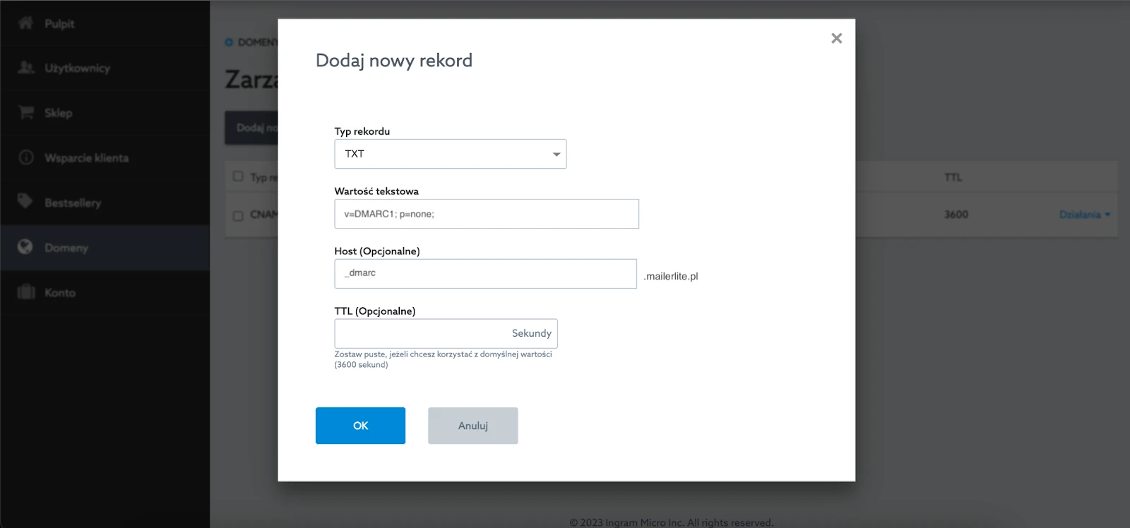 W tym miejscu uzyskasz dostęp do wszystkich rekordów Twojej domeny. Poniżej dowiesz się, jak dodać trzy z nich: DKIM, SPF i DMARC.