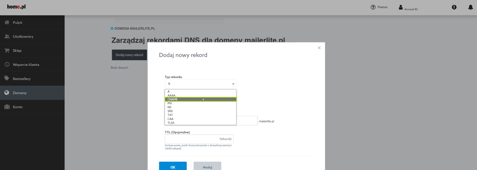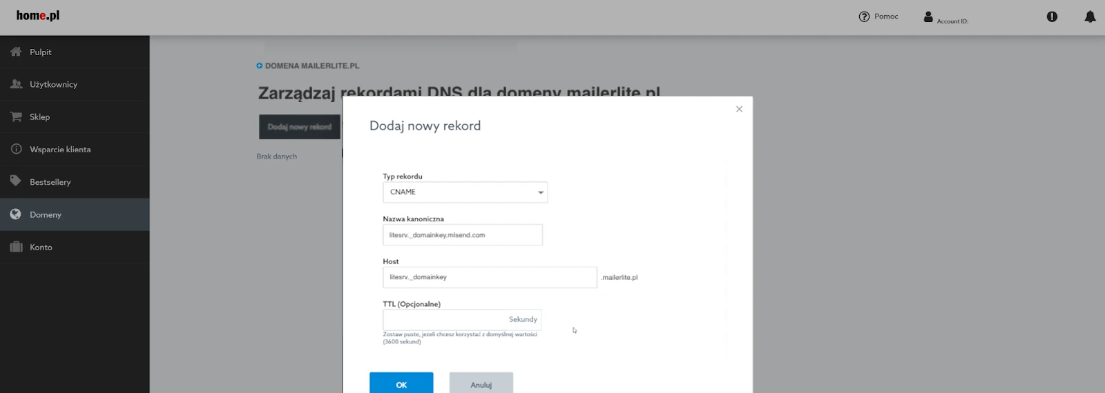 W MailerLite wartość Nazwy to np. litesrv._domainkey.example.com Home wymaga, aby w polu Host wpisać jedynie fragment litesrv._domainkey, czyli bez .example.com - Twoja domena będzie automatycznie uzupełniona w Home.pl obok pola do uzupełnienia danych.