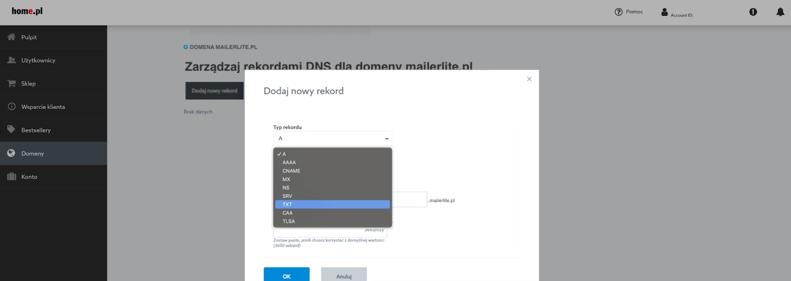 2. Po kliknięciu w przycisk Dodaj nowy rekord, pojawi się nowe okno. Wybierz tam typ rekordu TXT.