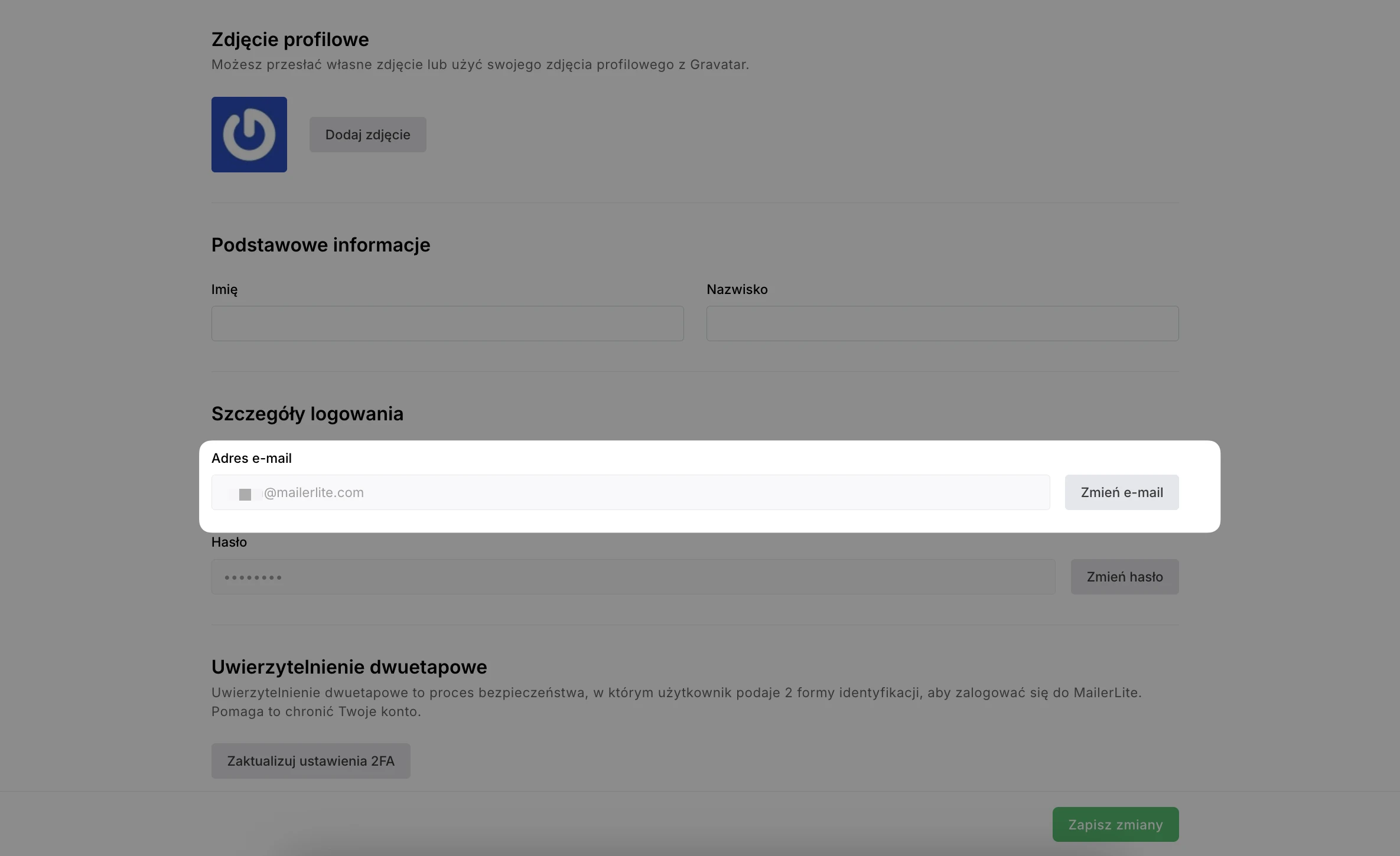 Obok pola Adres e-mail kliknij przycisk Zmień e-mail.