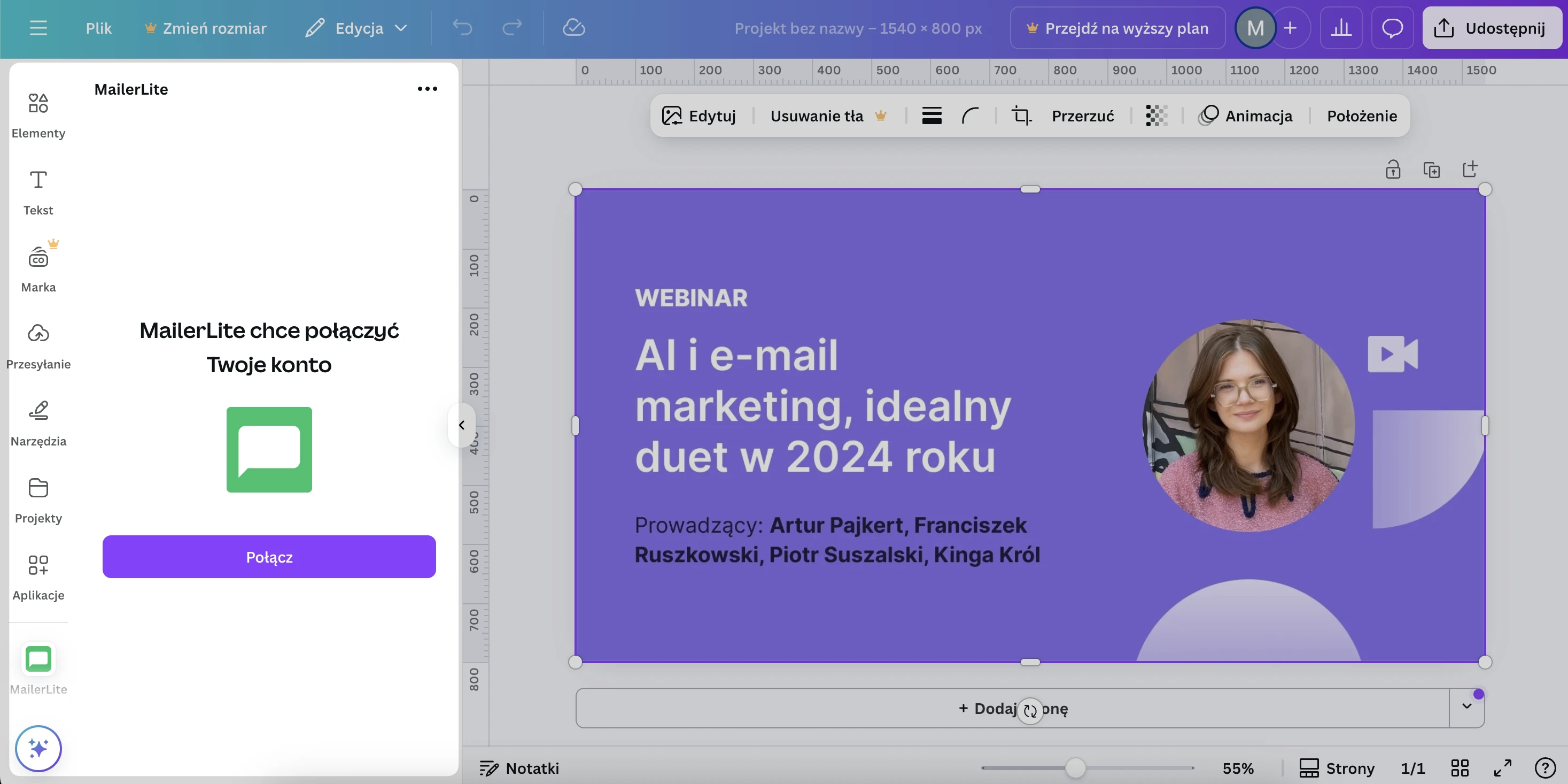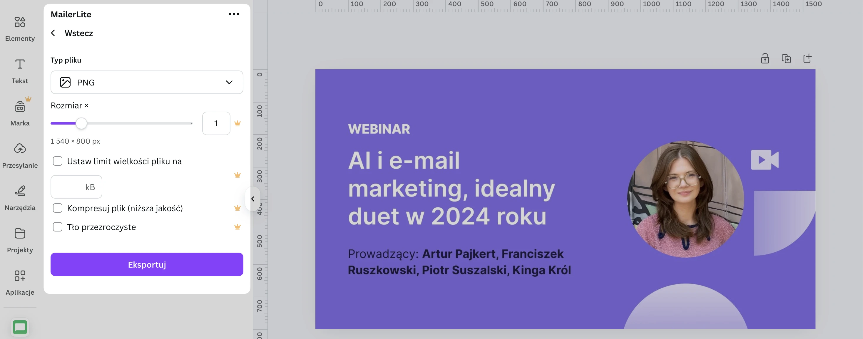 Canva oferuje szeroką gamę szablonów, grafik i czcionek, które pomogą Ci stworzyć piękne i profesjonalnie wyglądające treści do Twoich wysyłek. Po utworzeniu projektu w serwisie Canva możesz wyeksportować go bezpośrednio do menedżera plików w MailerLite. Następnie możesz używać swoich projektów w kampaniach, formularzach i na stronach internetowych.