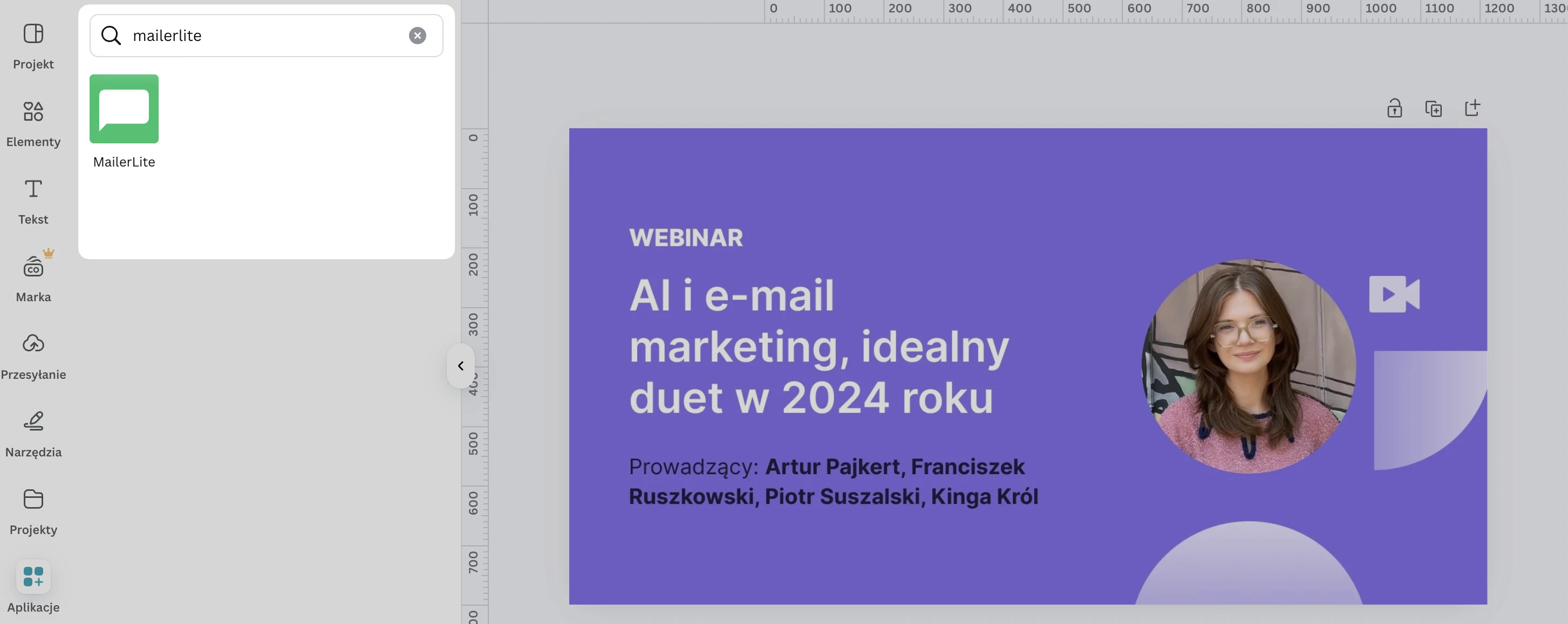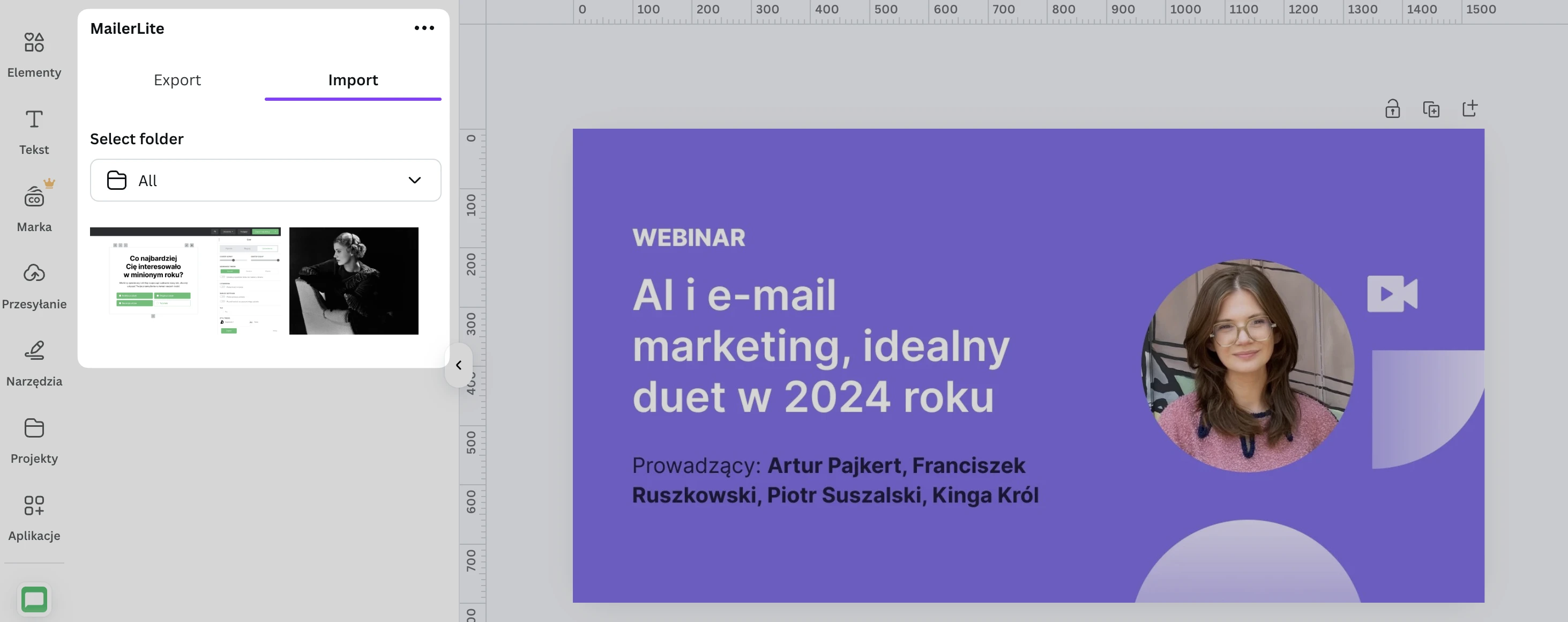 Możliwe jest również przeniesienie zdjęć z menedżera plików konta MailerLite do Canvy. Proces autoryzacji jest taki sam jak wyżej. Po połączeniu kont, wystarczy przejść do zakładki Import, aby wyświetlić pliki. Kliknij dowolny obraz, aby dodać go do projektu Canva.