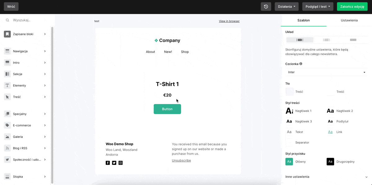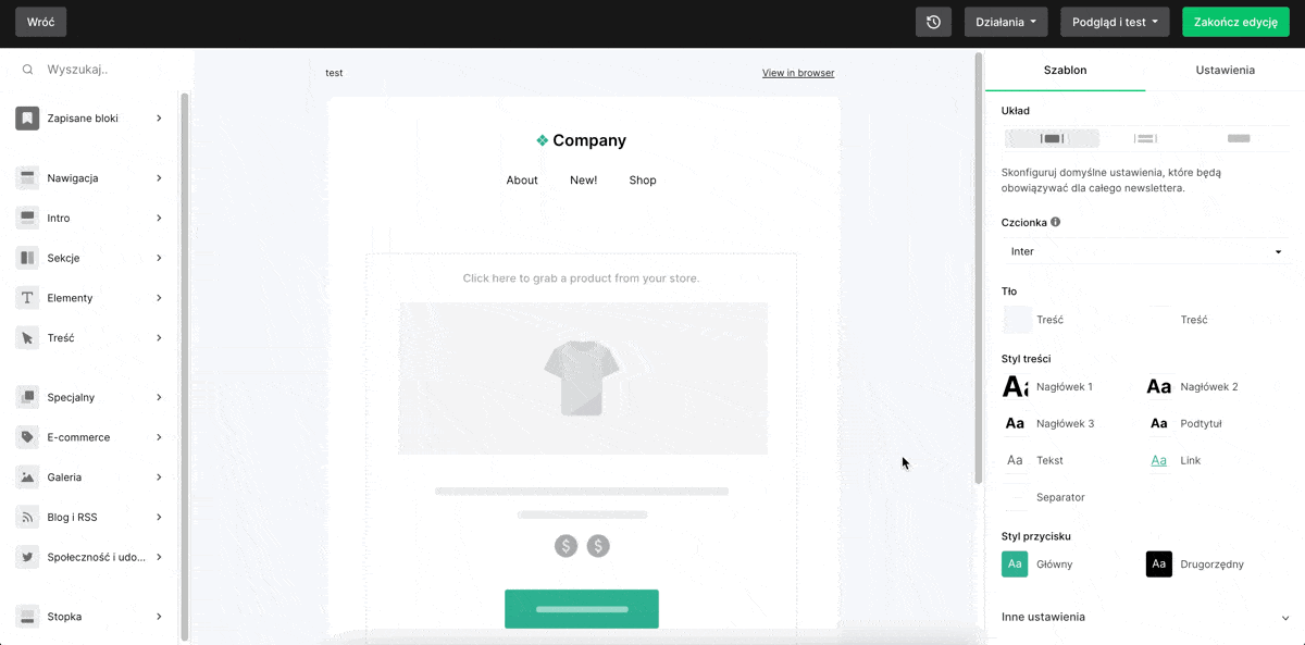 Przeciągnij i upuść preferowany blok produktu do newslettera.