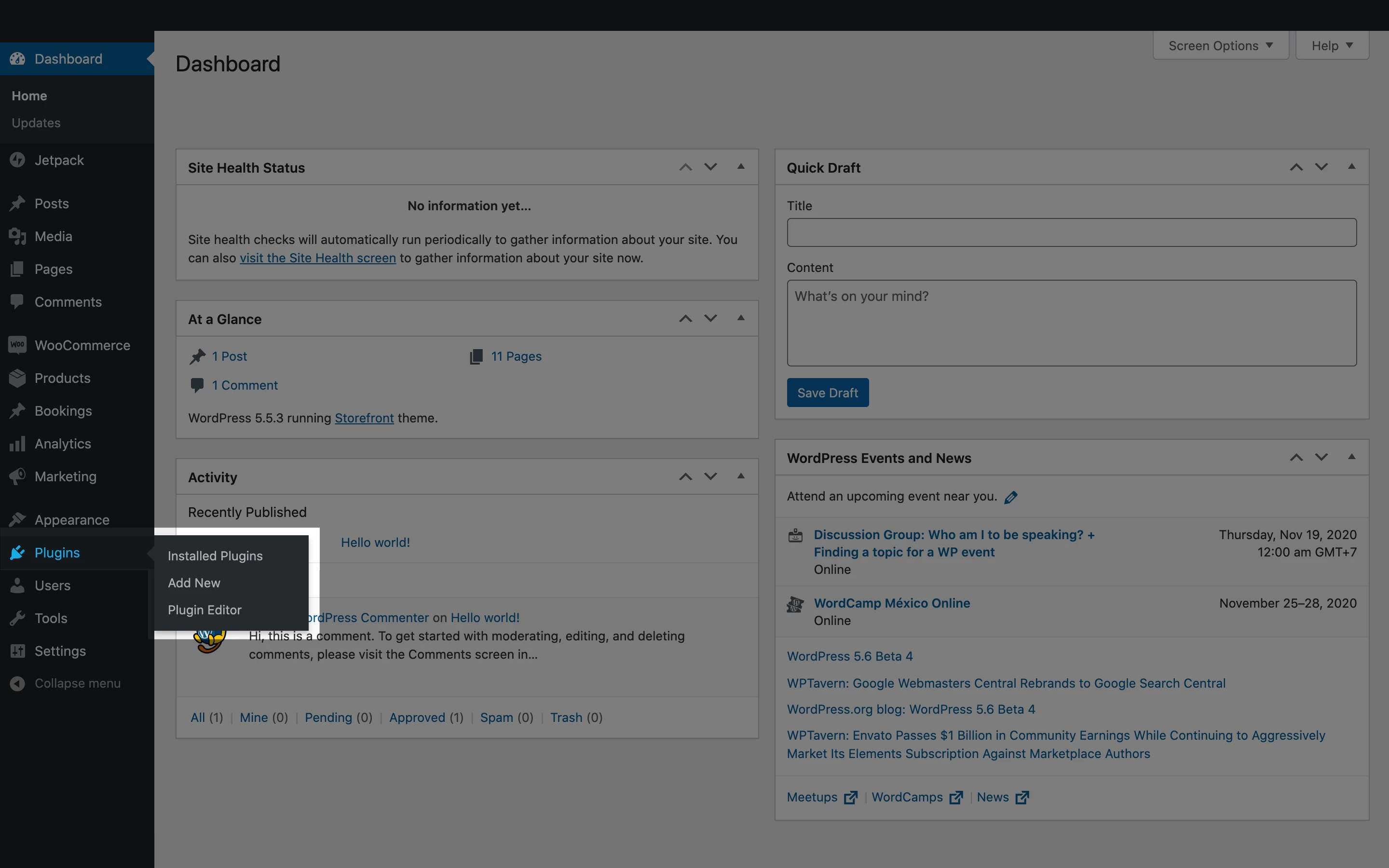Na bocznym menu kliknij Plugins (Wtyczki) i Add new (Dodaj nową).