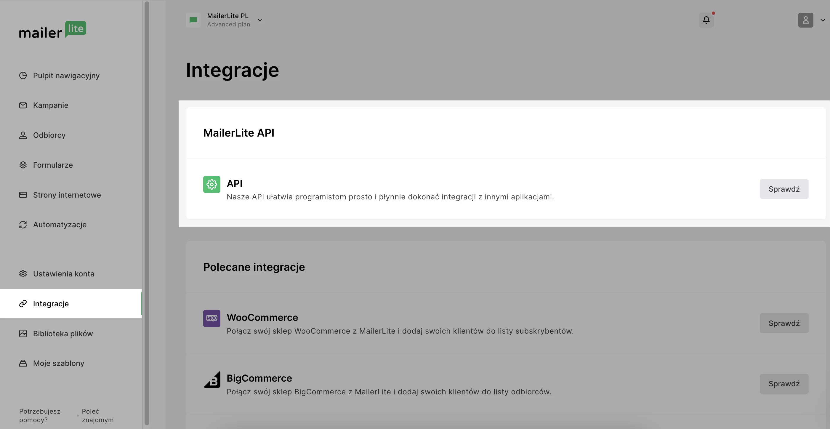 6. Potrzebny będzie klucz API. Aby go znaleźć, przejdź na Twoje konto MailerLite i do zakładki Integracje.
