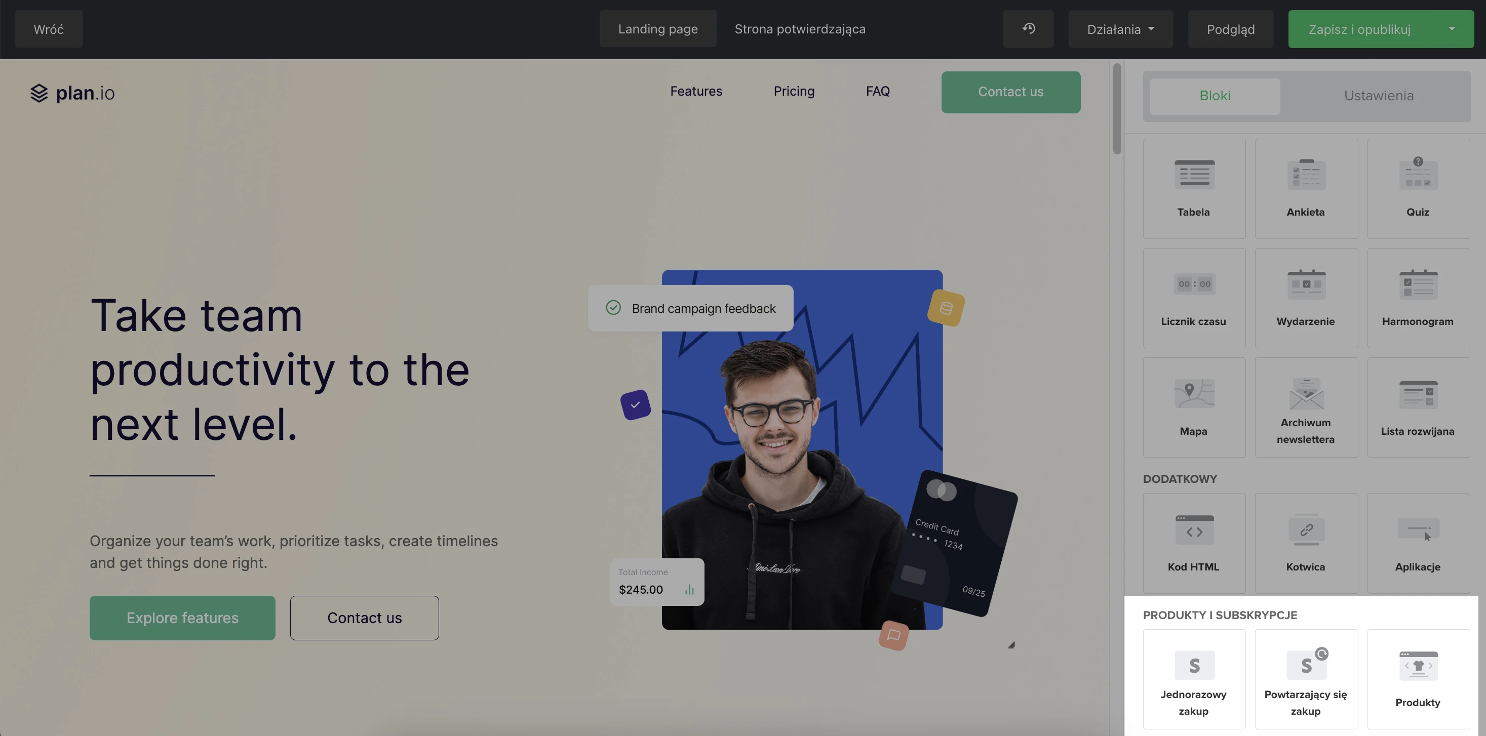 Bloki produktów dla landing page’y i stron internetowych możesz znaleźć bezpośrednio w edytorze stron. Przejdź do sekcji Bloki i kategorii Produkty i subskrypcje. Tam znajdziesz blok Produkty.