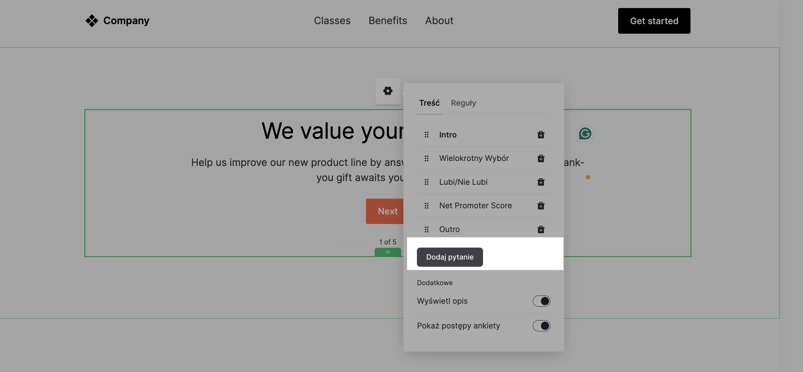 Uwaga: Po dodaniu bloku Ankiety do landing page'a zauważysz, że zarówno blok Quizu, jak i Ankiety będą wyszarzone. Wynika to z faktu, że na landing page'u można umieścić tylko jeden blok Quizu lub Ankiety.