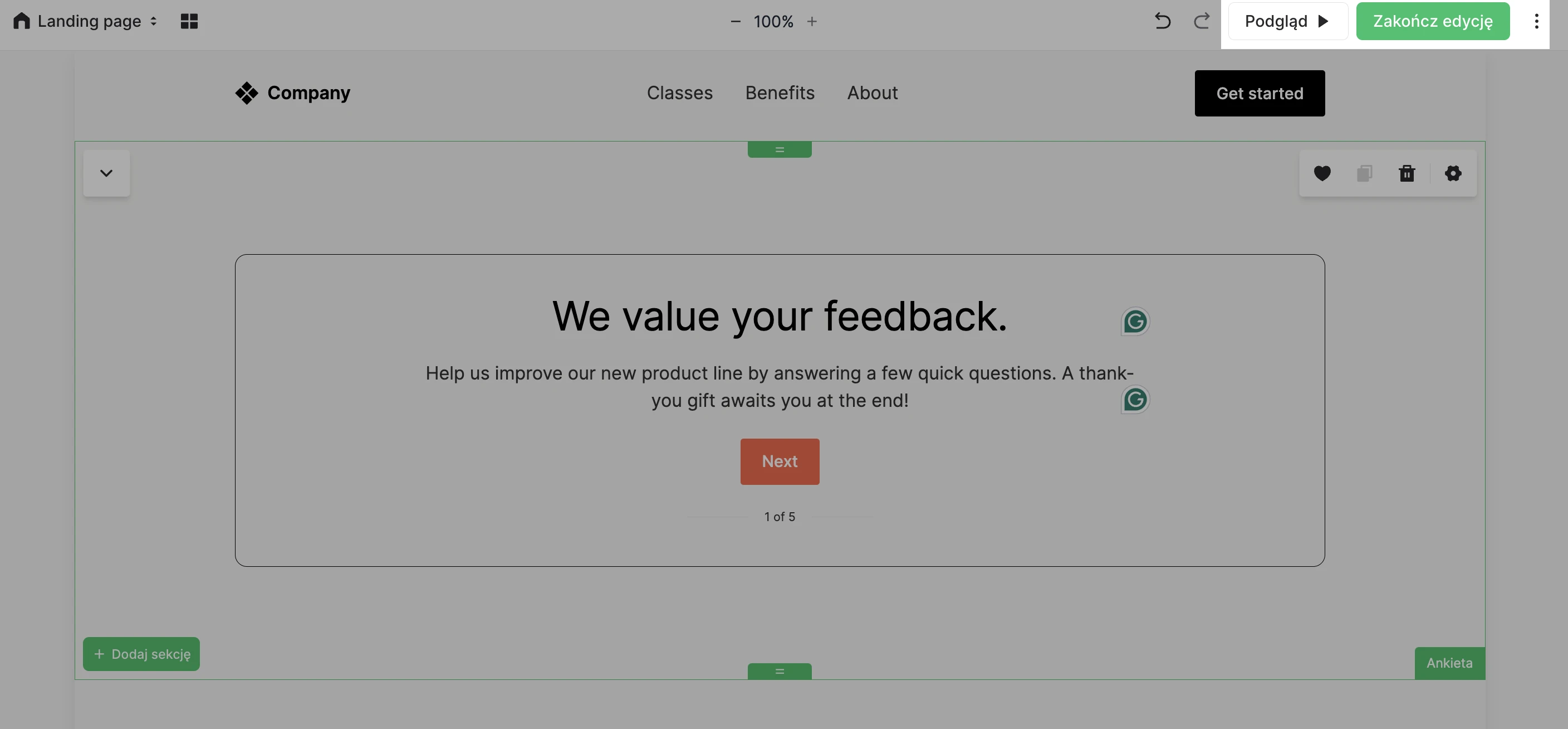 Gdy będziesz zadowolony z wyglądu landing page'a i ankiety, możesz zapisać i opublikować landing page, klikając przycisk Zakończ edycję.