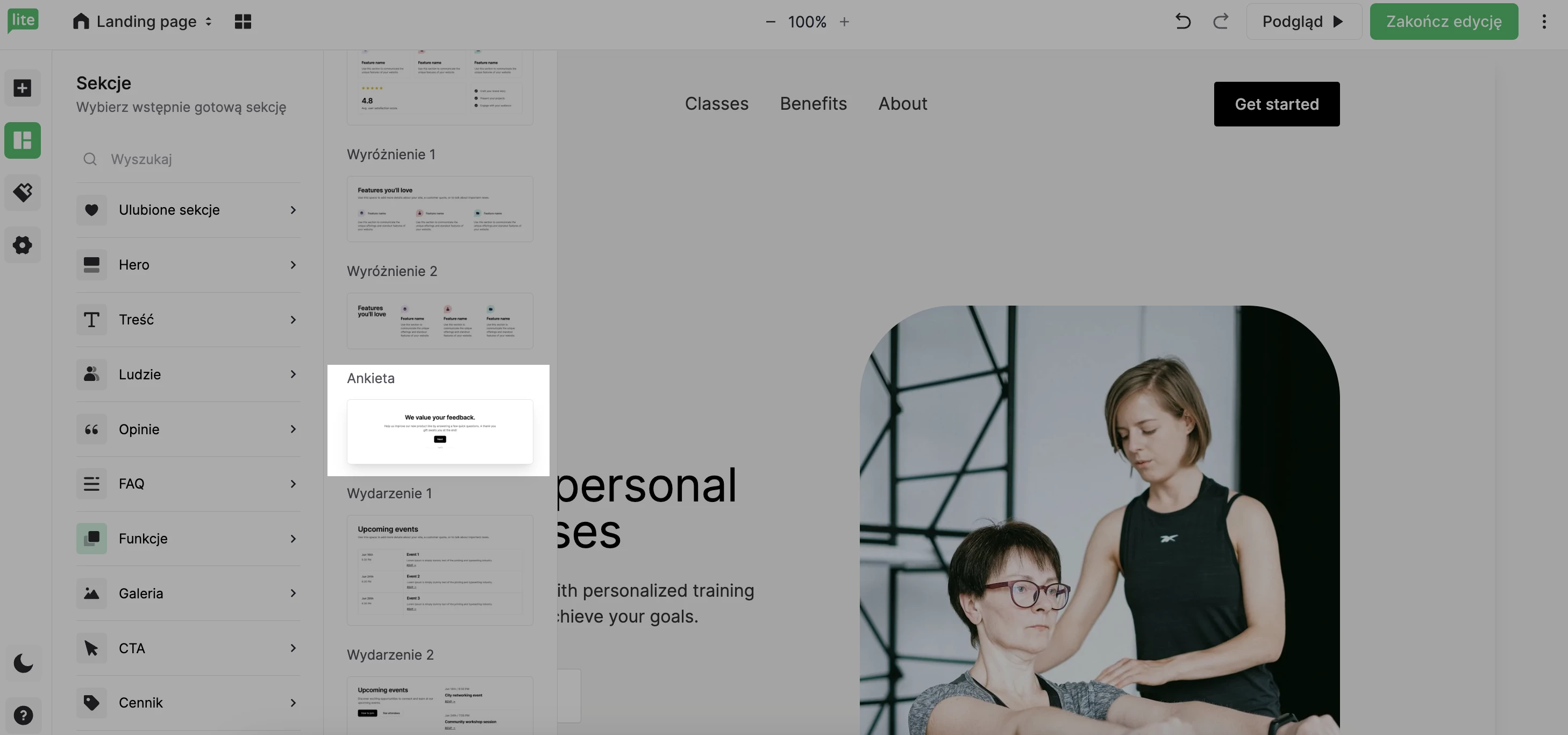 Teraz nadszedł czas, aby dodać blok ankiety! Kliknij zakładkę Sekcje i znajdź opcję Funkcje. Przeciągnij blok Ankiety z paska bocznego i upuść go na landing page'u.
