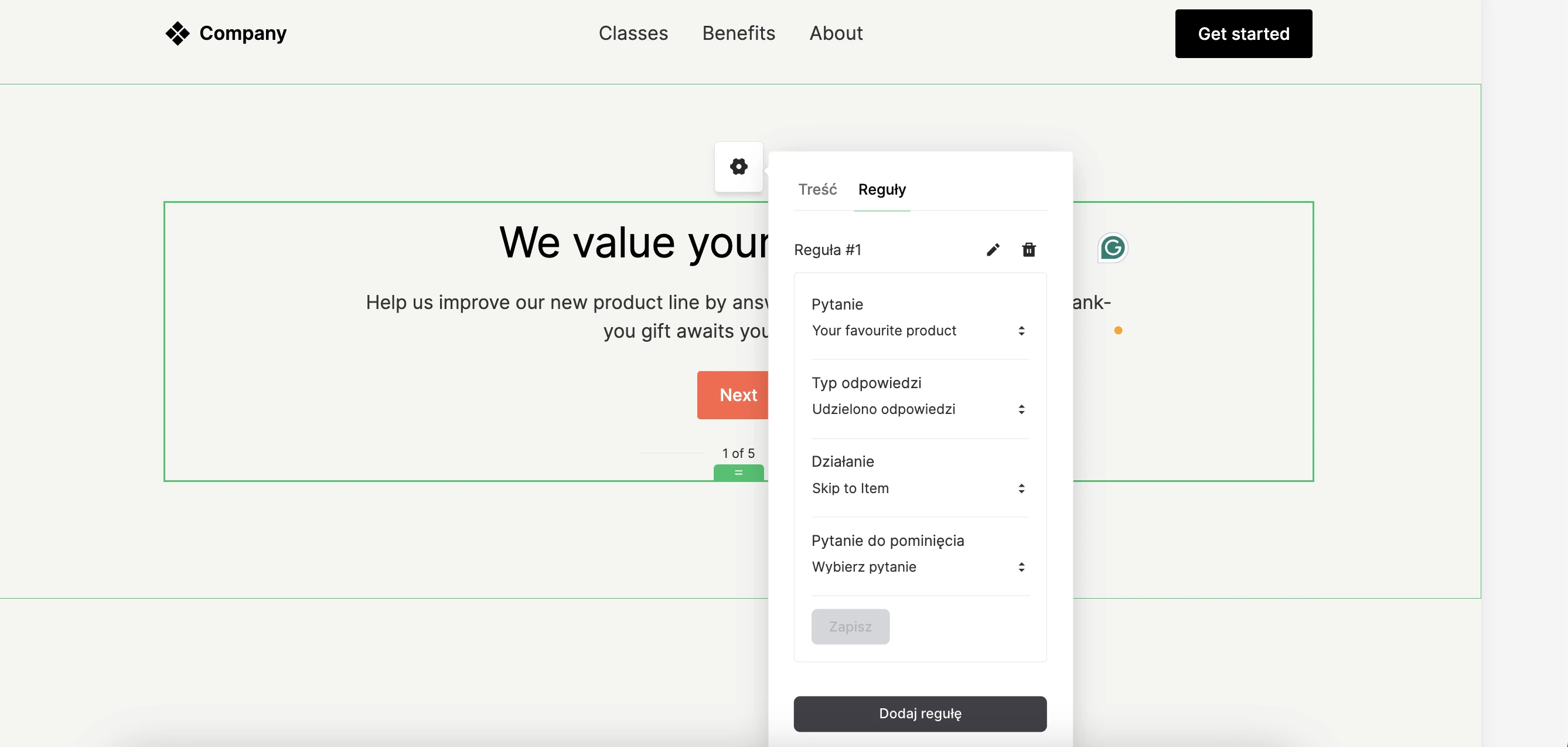 Możesz sprawić, aby ankieta była funkcjonalna, dodając reguły. W zakładce Reguły można wstępnie zdefiniować regułę, która pomija pytania na podstawie odpowiedzi uczestnika na inne pytanie.