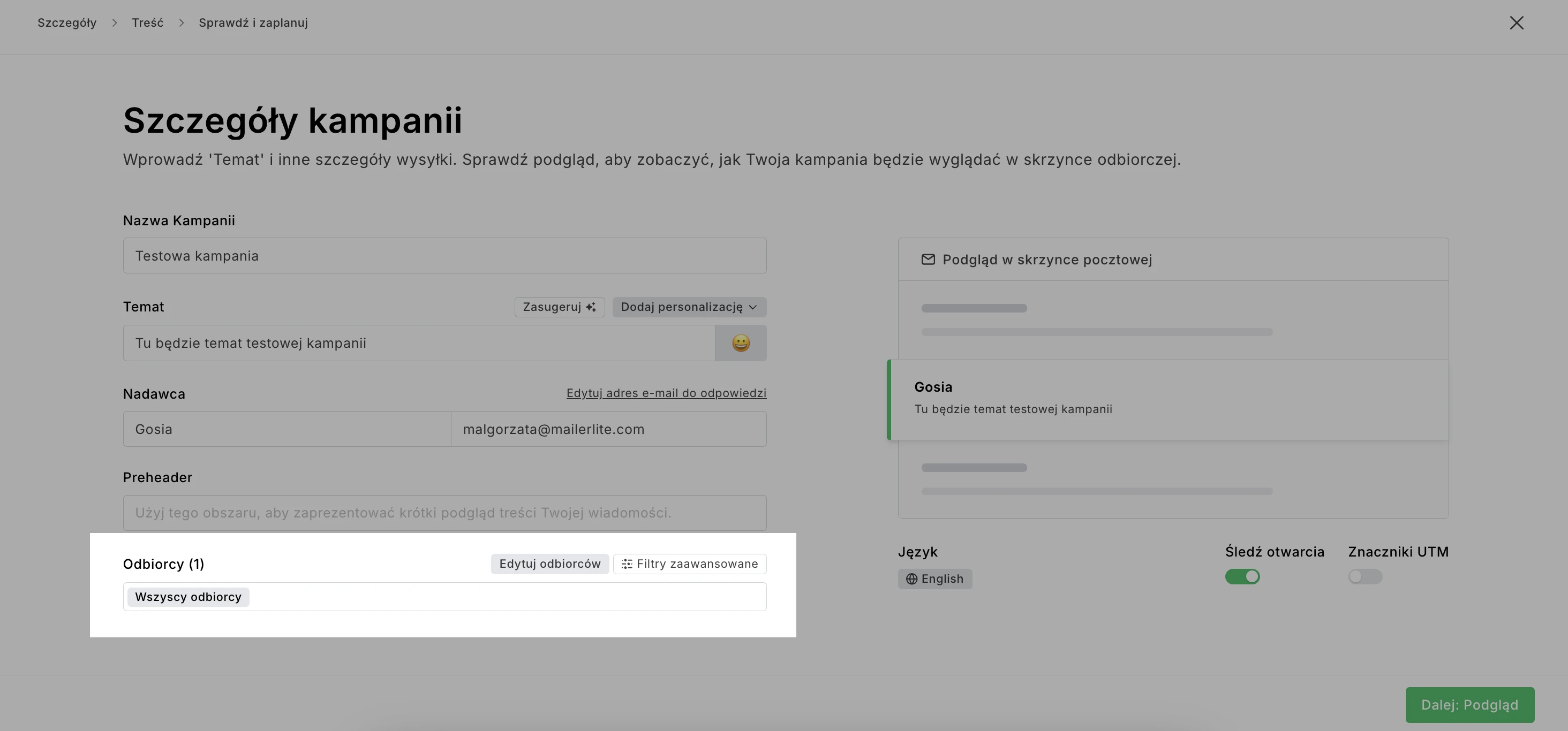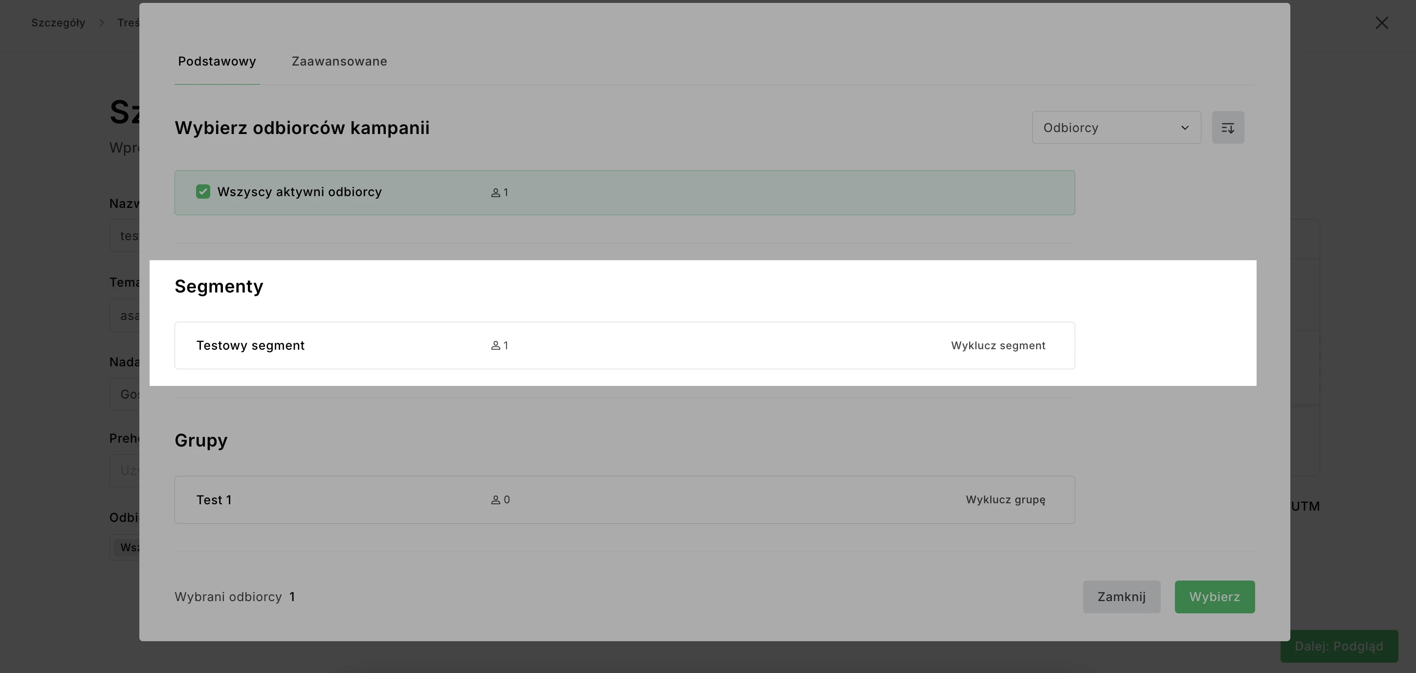 Aby włączyć segment do kampanii, podczas wybierania odbiorców wybierz segment, który ma otrzymać newsletter.