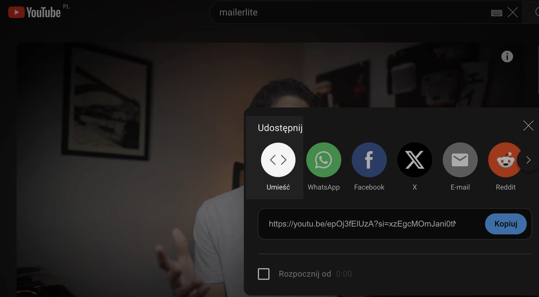 Poszukaj opcji udostępniania lub osadzania. Zazwyczaj znajduje się ona pod filmem lub w menu udostępniania.