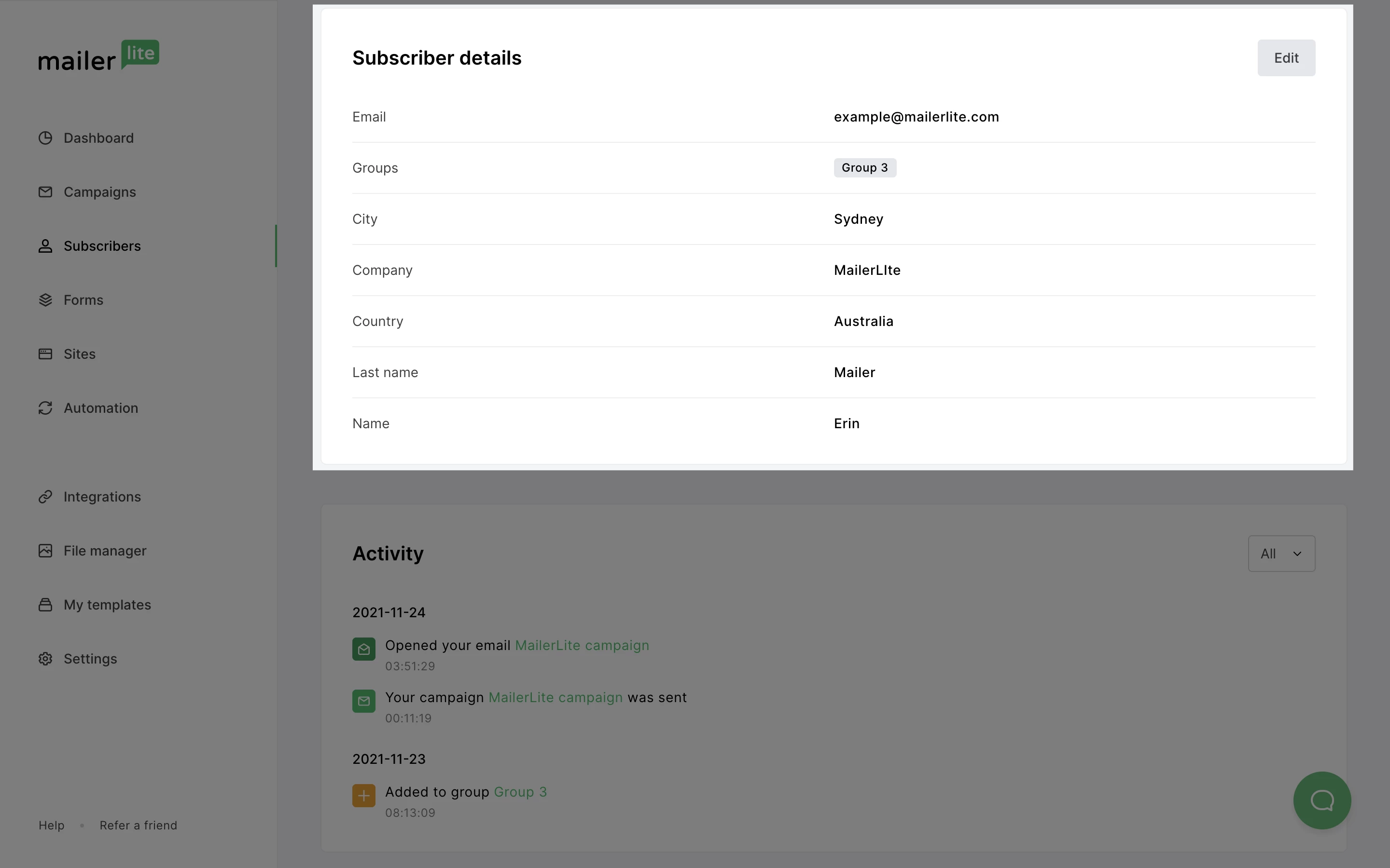 Uwaga: Adres e-mail subskrybenta może być edytowany tylko raz w miesiącu, a wszelkie aktualizacje adresu e-mail będą widoczne w sekcji Aktywność w profilu subskrybenta.