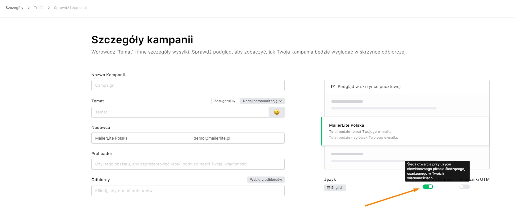Śledzenie wszystkich wiadomości e-mail jest domyślnie włączone w MailerLite. Jeśli chcesz wyłączyć śledzenie dla konkretnej kampanii lub automatyzacji e-mail, możesz to zrobić przed wysłaniem.